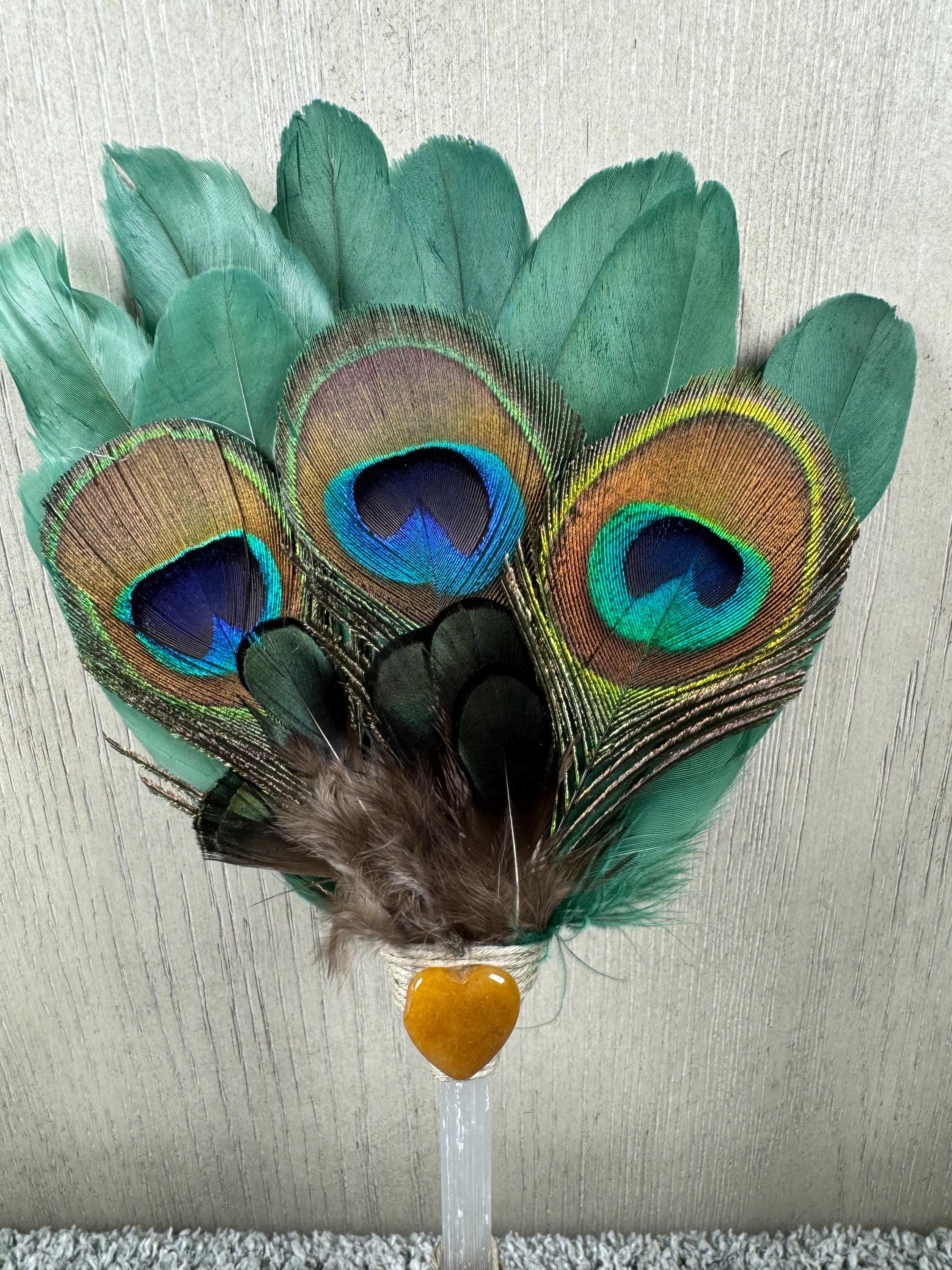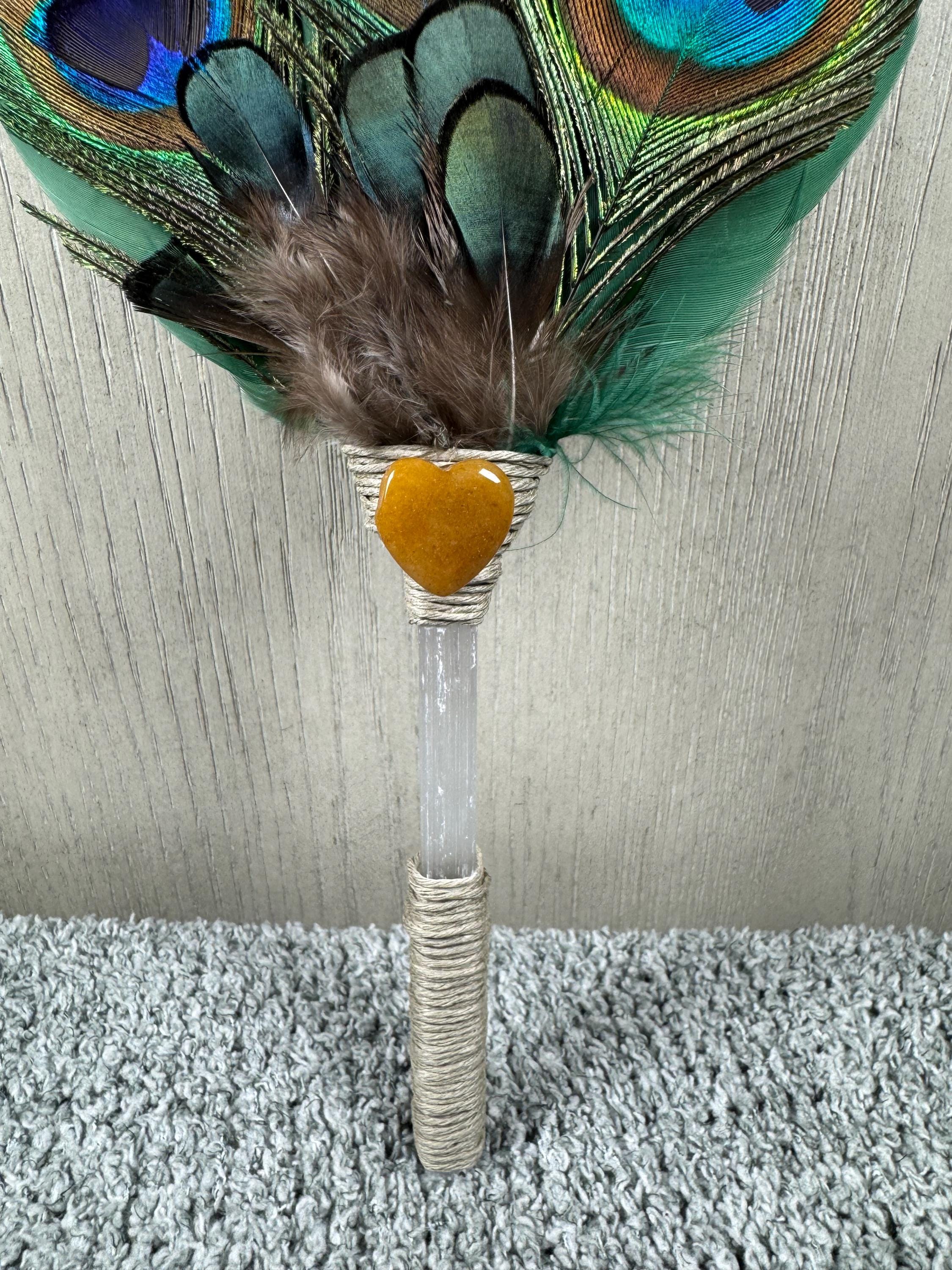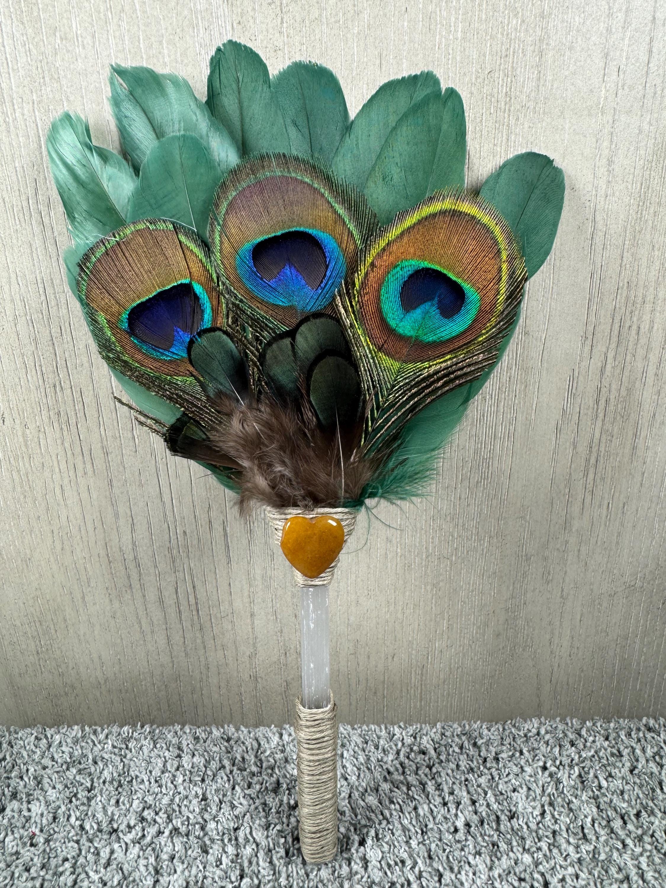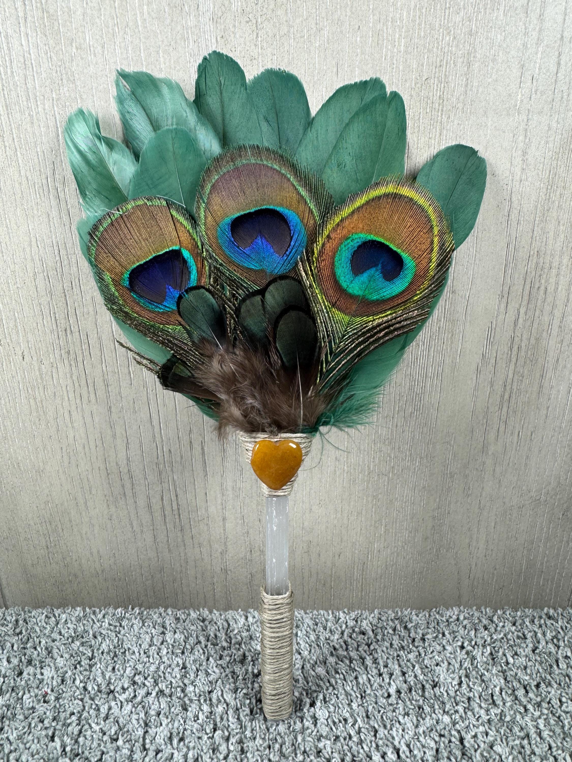 11" Smudging Feather Fan/Ceremonial. Made with 4 Different types of feathers, Selenite Handle, and a Crystal. The feathers are not plucked they are harvested FALLEN feathers. The handle and top of fan where feathers are attached are wrapped with Hemp. The ritual feather fan is used to smudge spaces with Palo Santo, Sage and other incenses. When smudging, use the feather fan to softly direct the smoke to the desired direction. Keep it in a sacred place like an altar. Blessed Be!