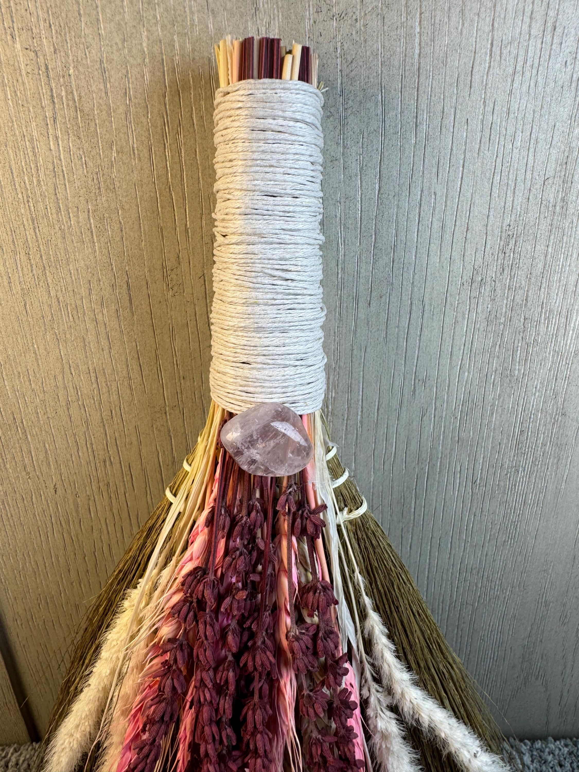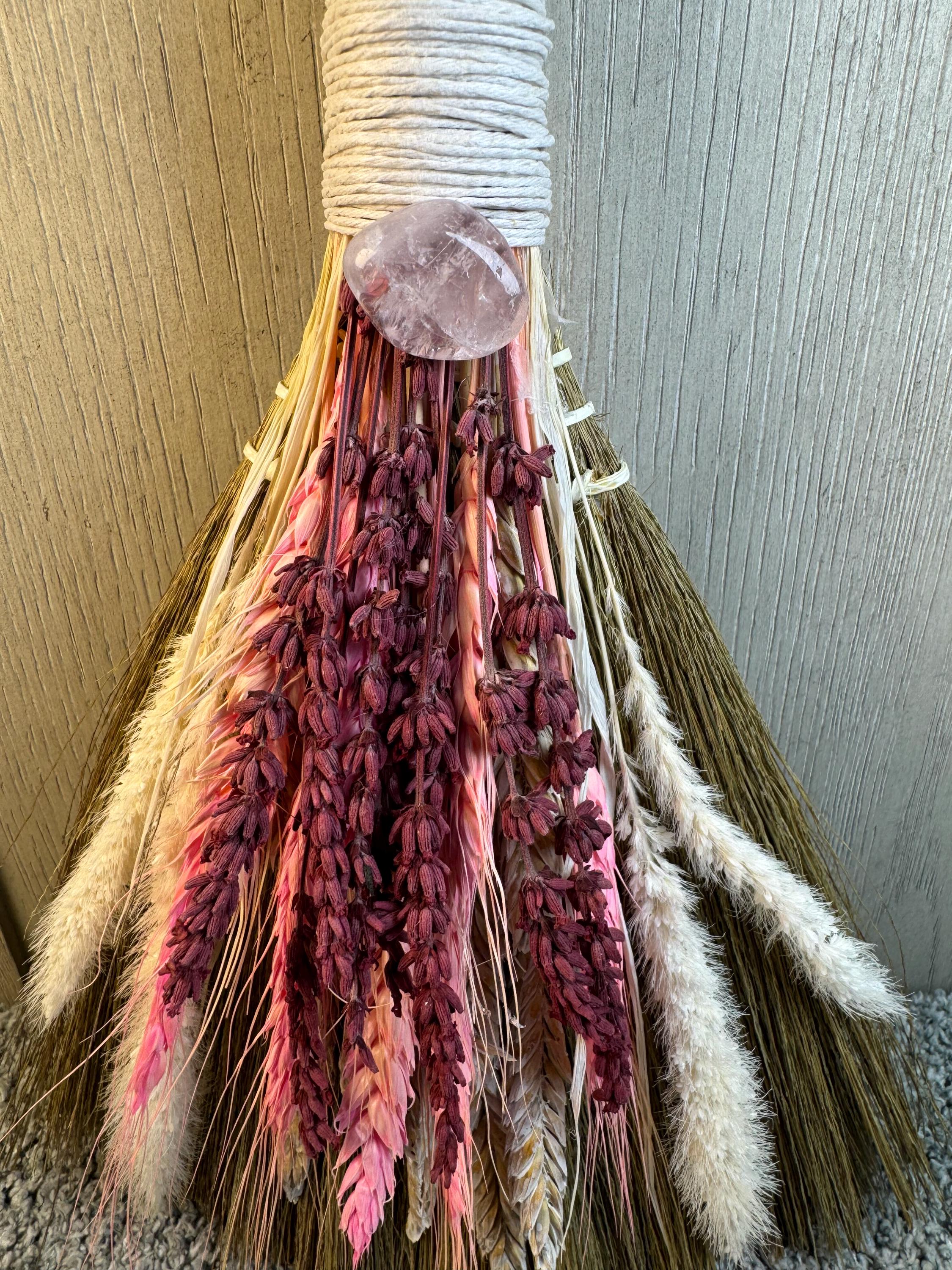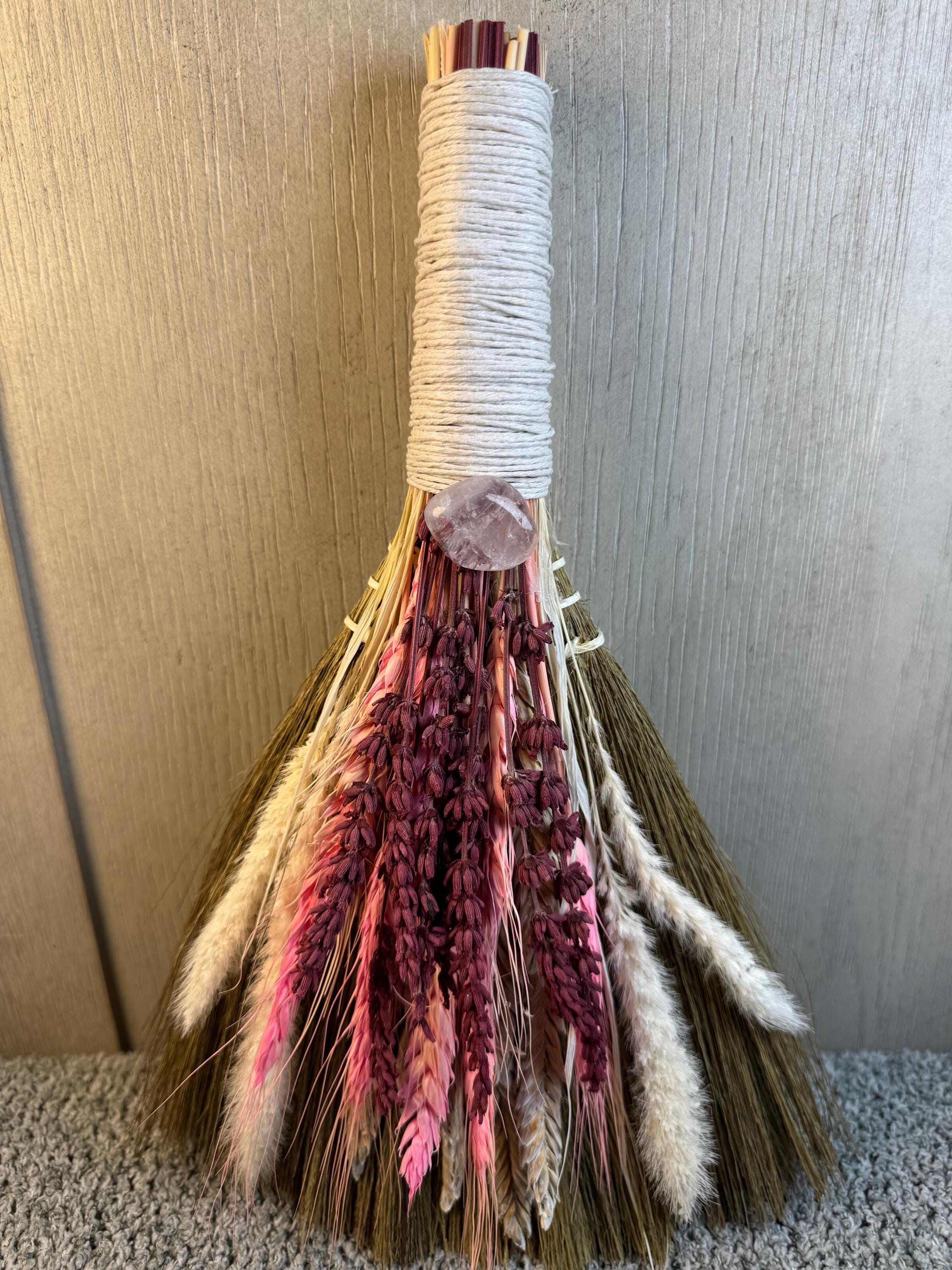An altar besom is used in witchcraft for magical cleansing, purifying an altar space by sweeping away negative energy, and preparing the area for ritual. It is also used for other purposes like protection, marking sacred boundaries, and as a symbolic element in handfasting ceremonies. Made with real preserved dried flowers, pink quartz at the end of handle, and measures 12" Long.