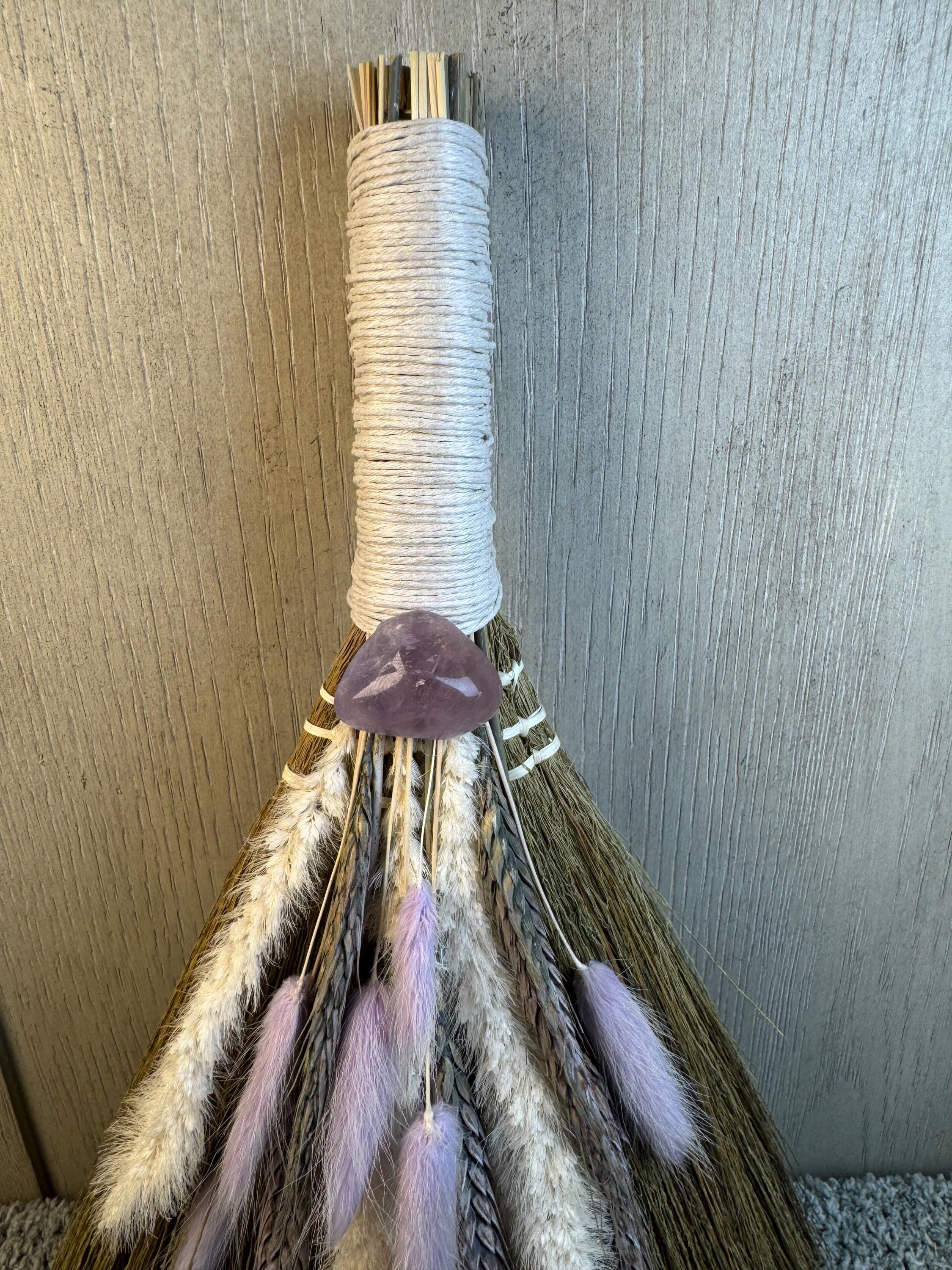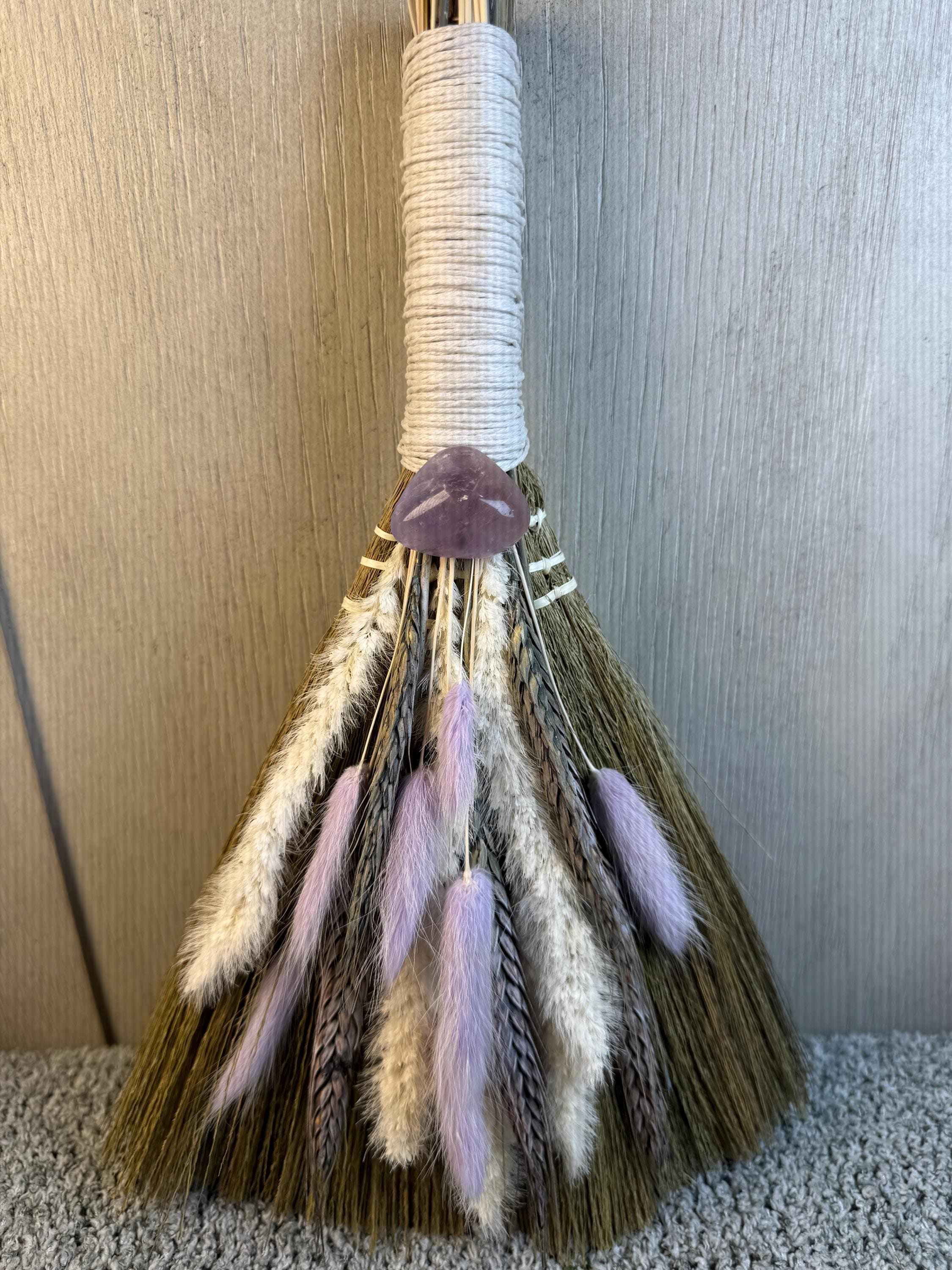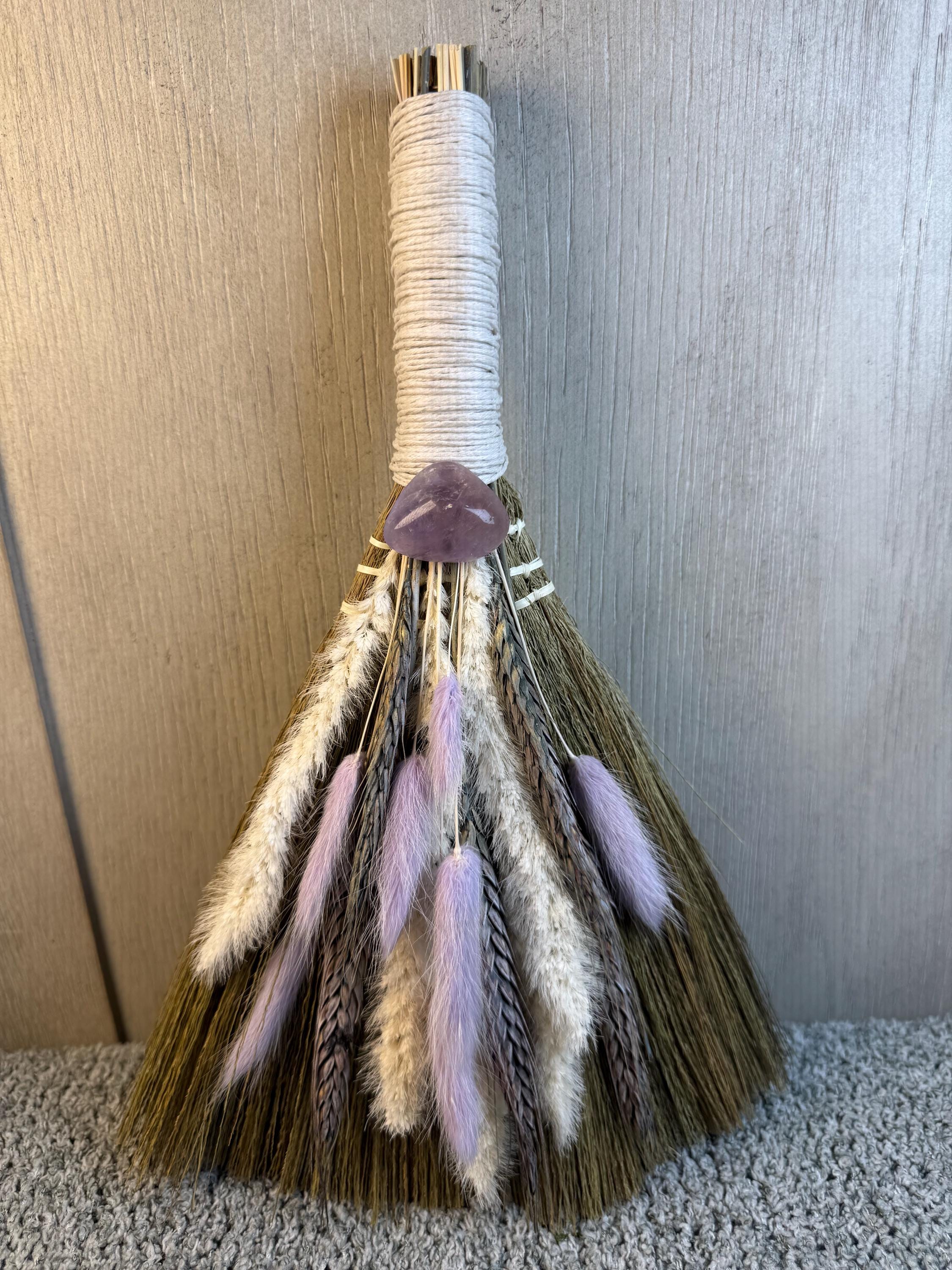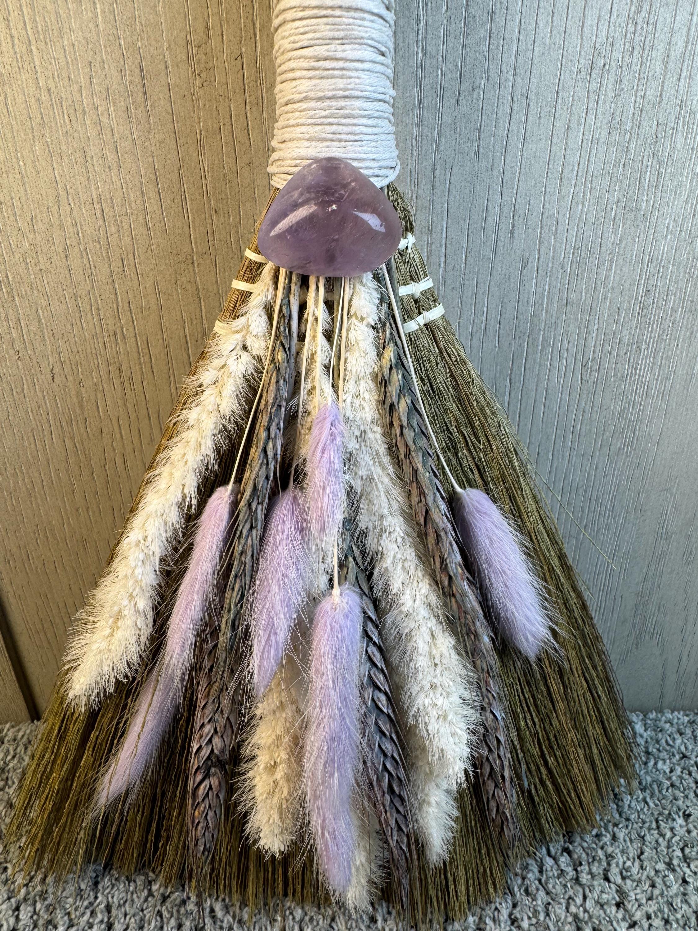 An altar besom is used in witchcraft for magical cleansing, purifying an altar space by sweeping away negative energy, and preparing the area for ritual. It is also used for other purposes like protection, marking sacred boundaries, and as a symbolic element in handfasting ceremonies. Made with real preserved dried flowers, Amethyst Crystal at the end of handle, and measures 12" Long.