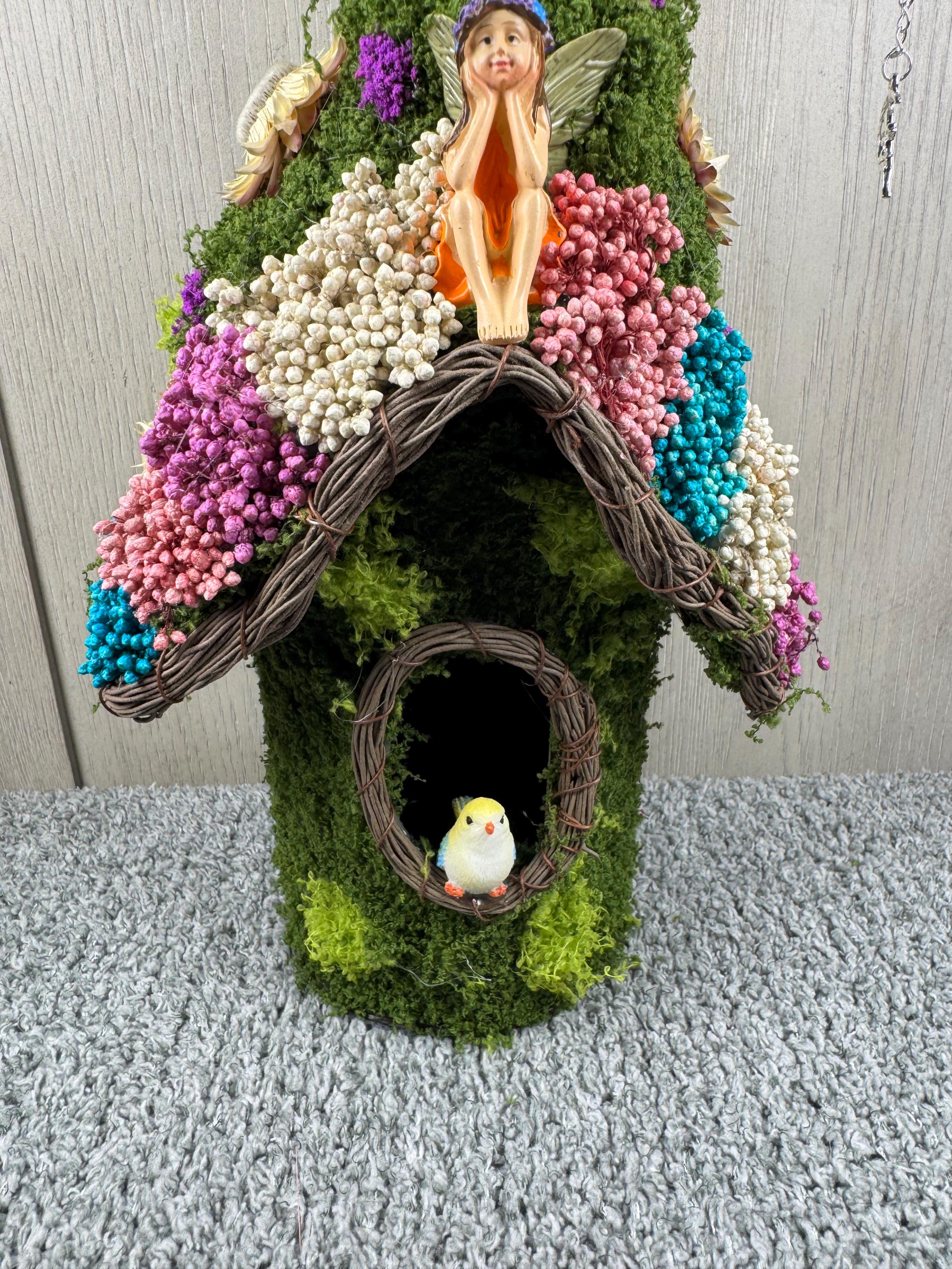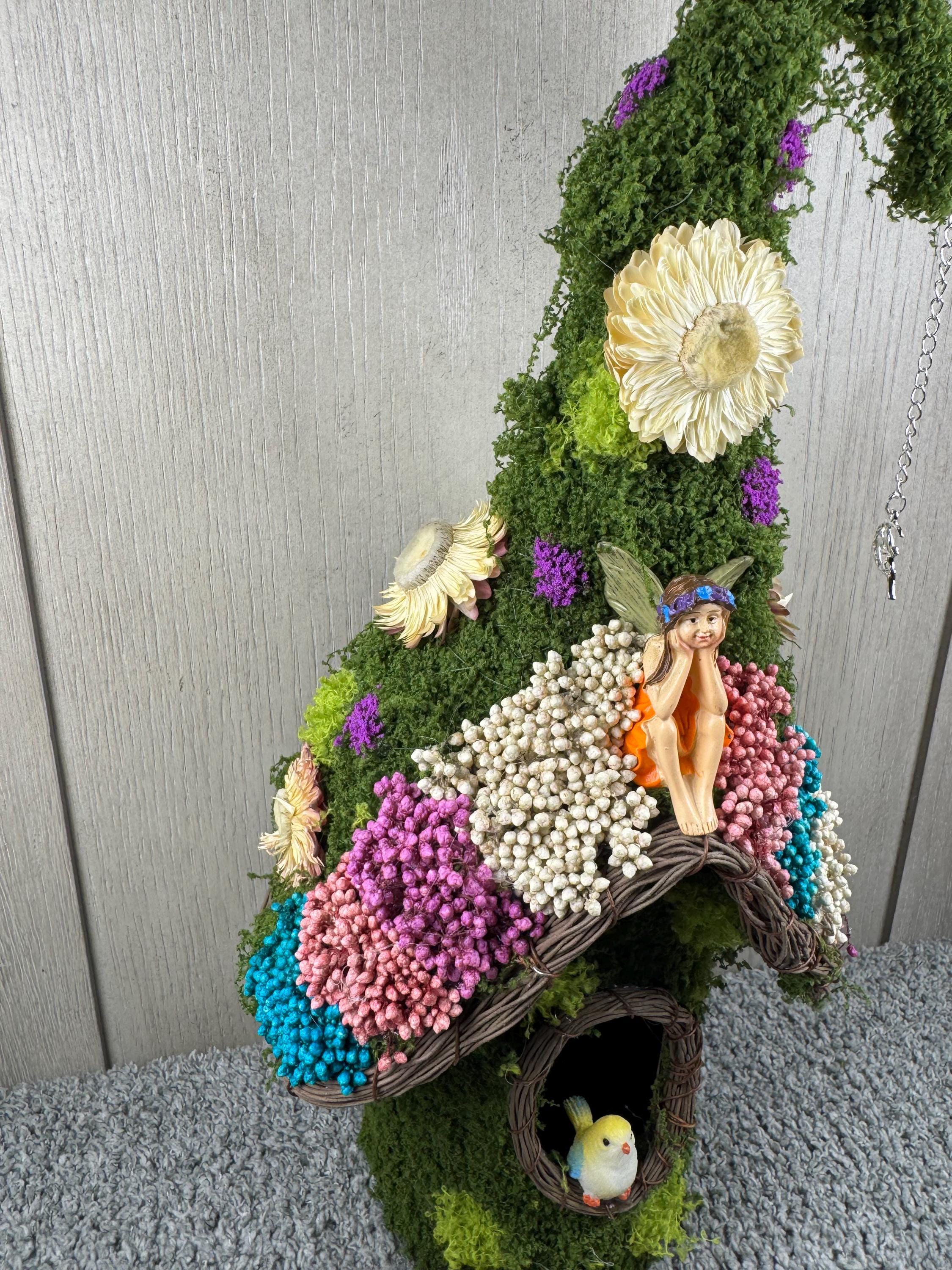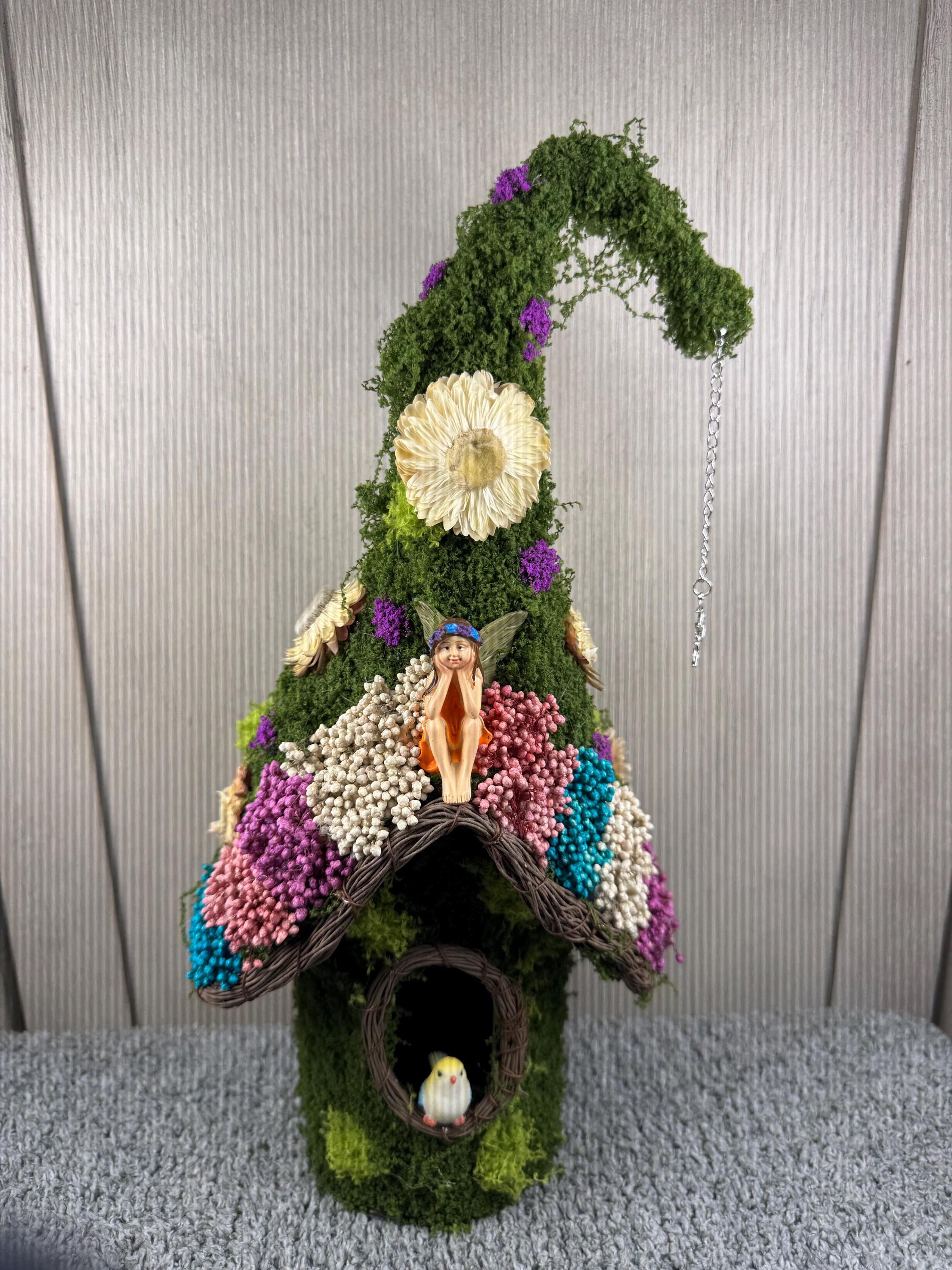 12" Birdhouse with Green Moss, Dried Preserved Flowers, Resin Bird, Resin Fairy, and a Silver Fairy Charm on a Crescent Moon hanging from the end. Perfect decoration for the Fairy Lover in all of us. Blessed Be.