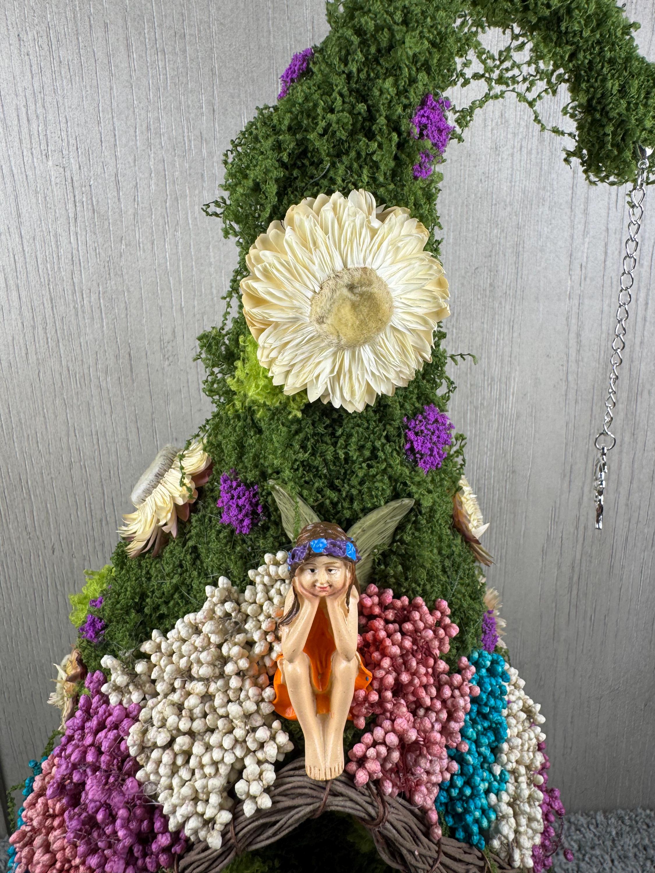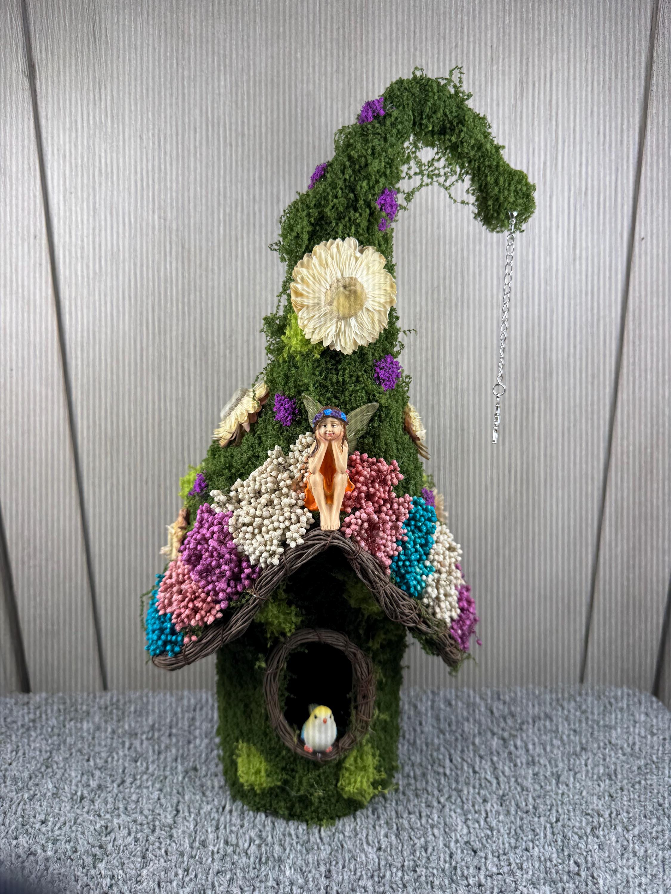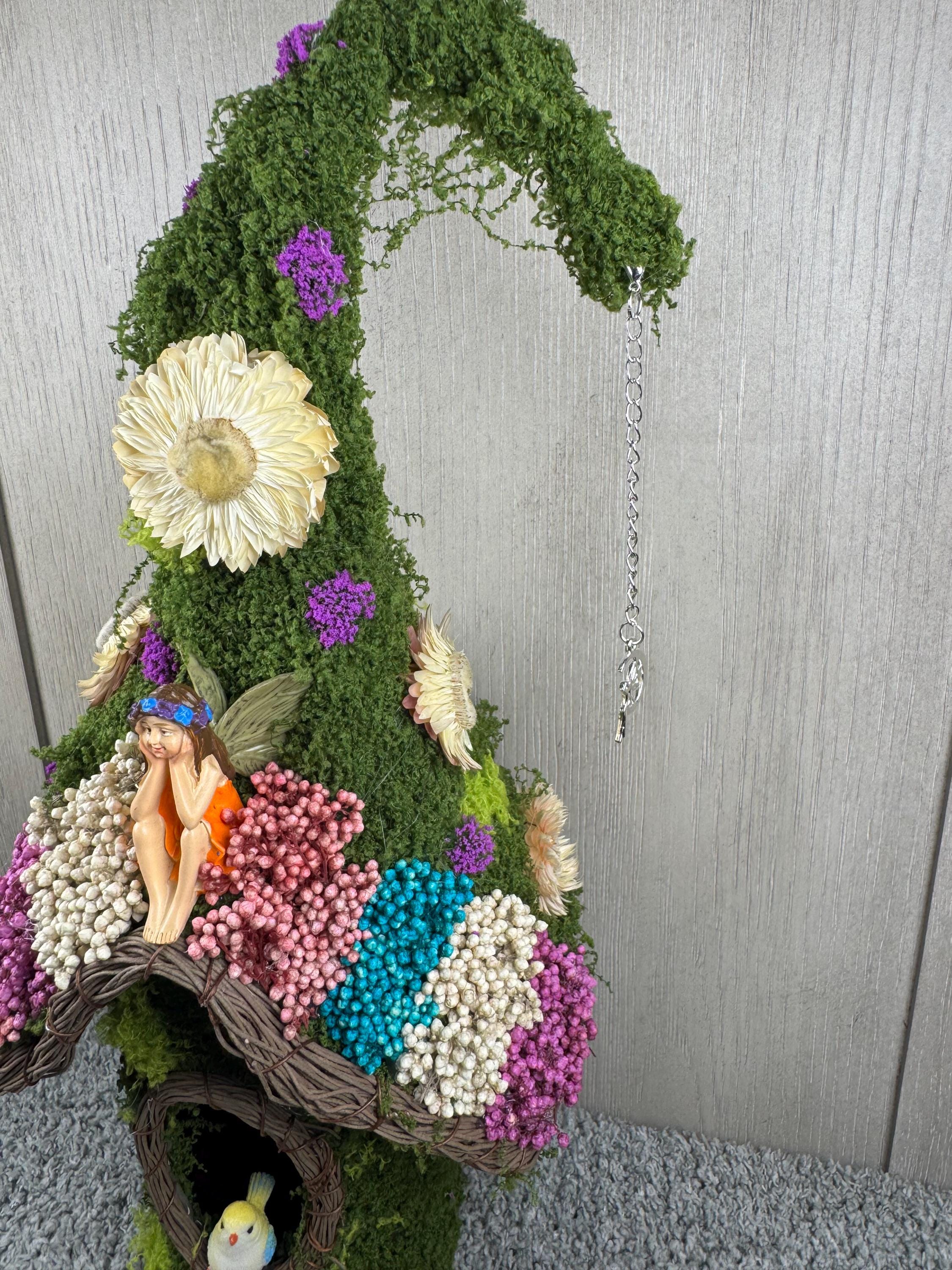 12" Birdhouse with Green Moss, Dried Preserved Flowers, Resin Bird, Resin Fairy, and a Silver Fairy Charm on a Crescent Moon hanging from the end. Perfect decoration for the Fairy Lover in all of us. Blessed Be.