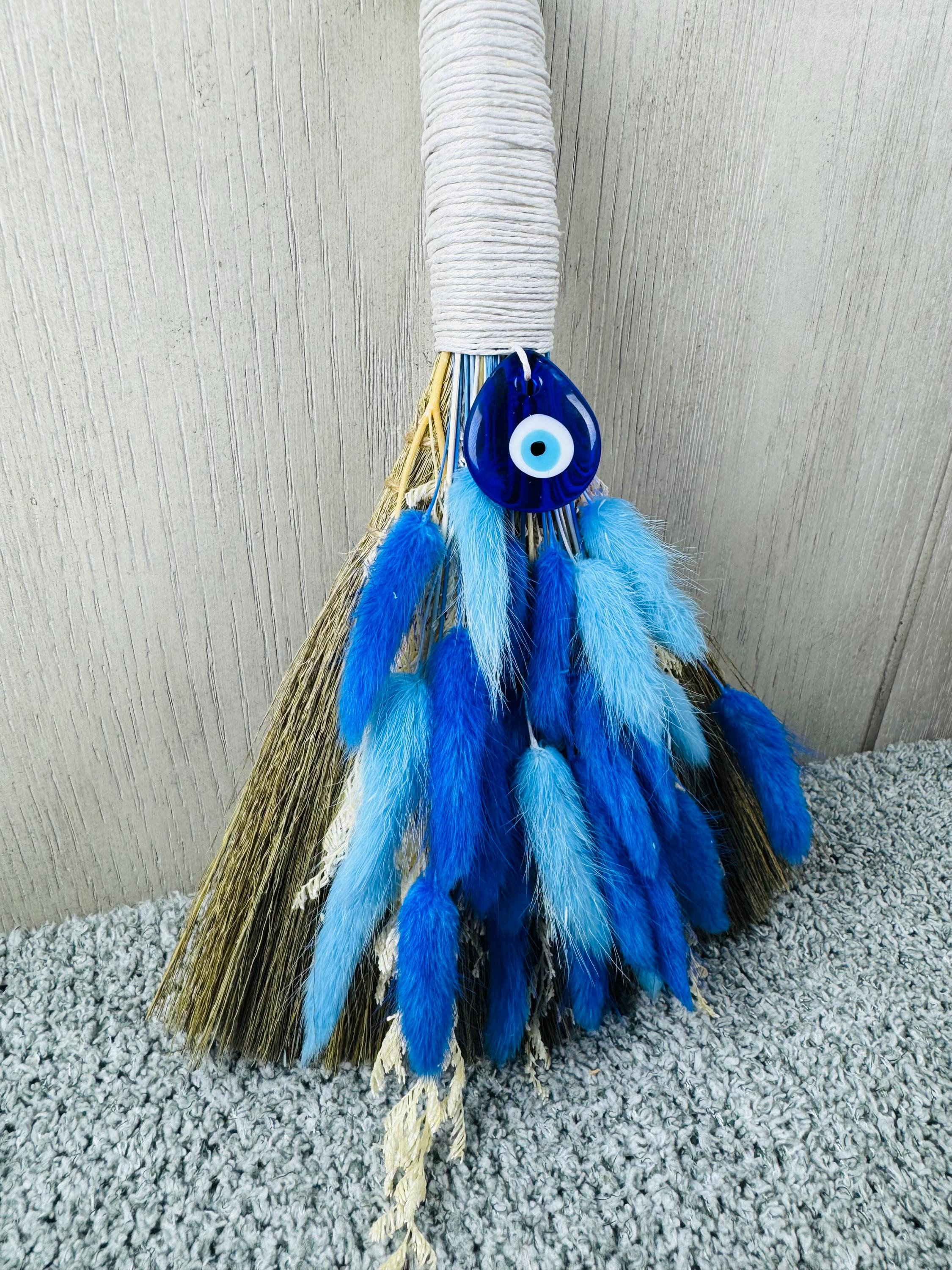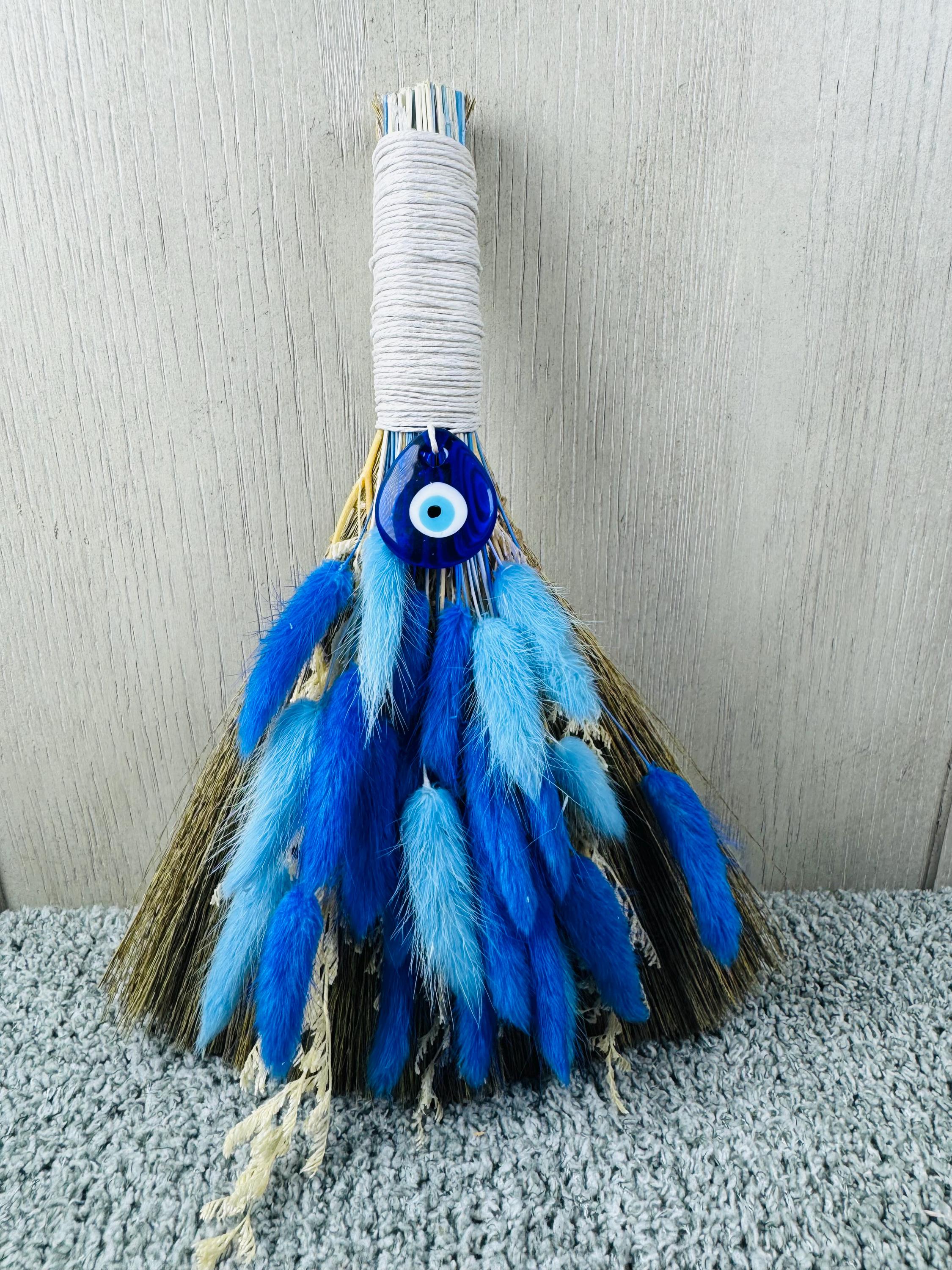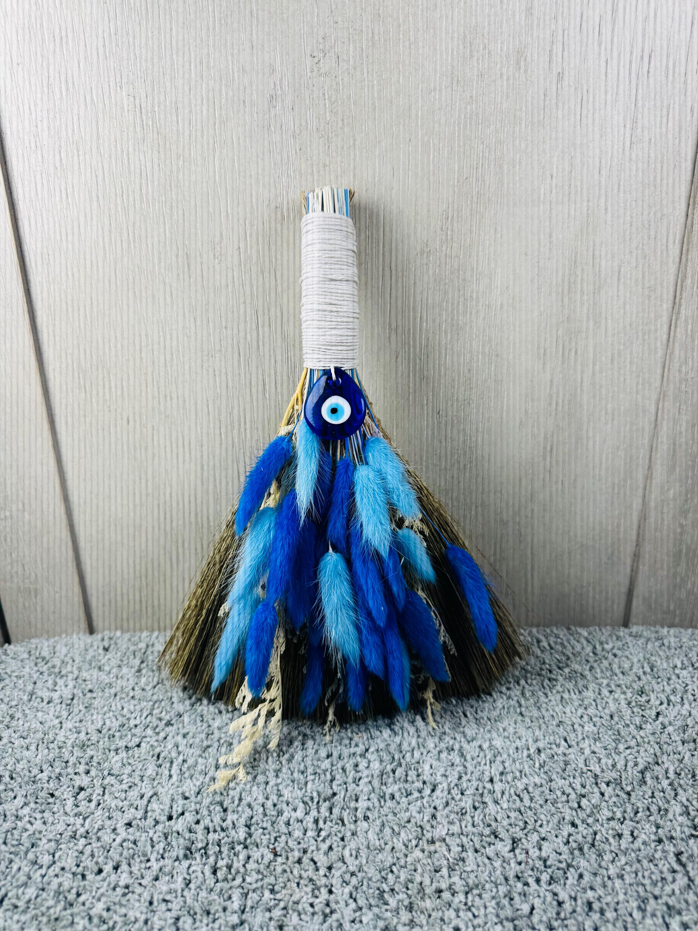 An altar besom is used in witchcraft for magical cleansing, purifying an altar space by sweeping away negative energy, and preparing the area for ritual. It is also used for other purposes like protection, marking sacred boundaries, and as a symbolic element in handfasting ceremonies. Made with real preserved dried flowers, the handle is wrapped with hemp, glass Evil Eye Charm, and measures 10" Long.