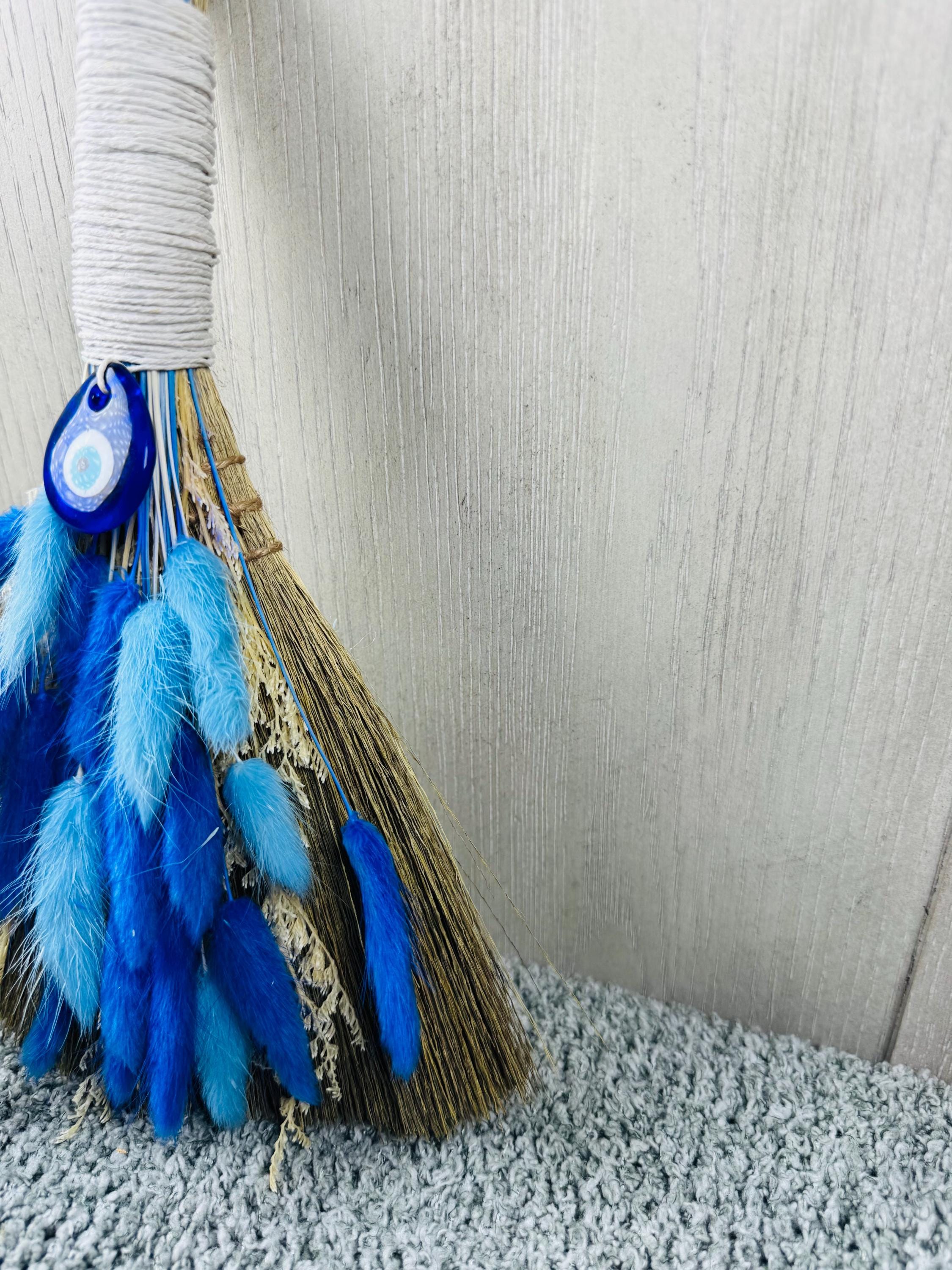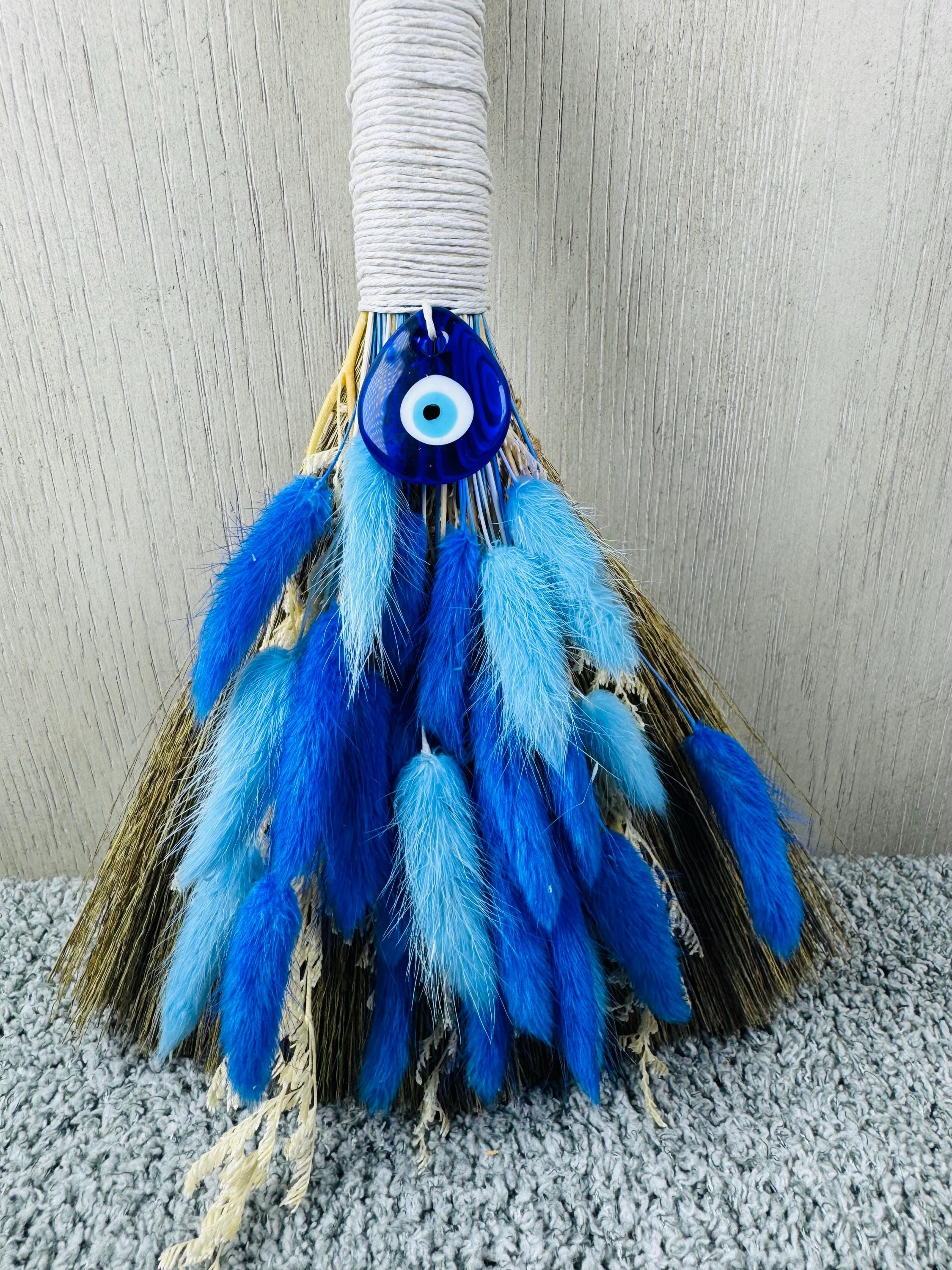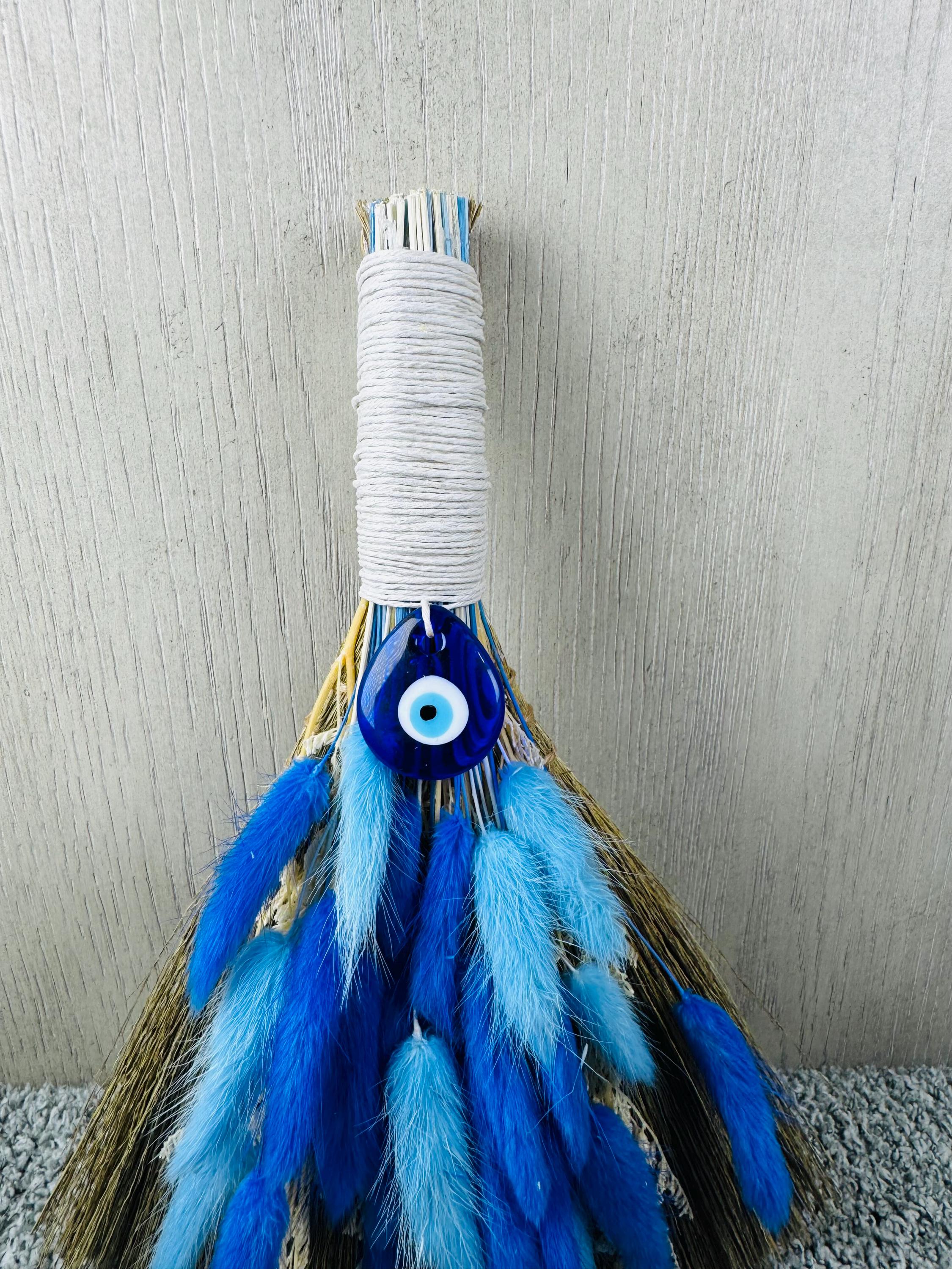 An altar besom is used in witchcraft for magical cleansing, purifying an altar space by sweeping away negative energy, and preparing the area for ritual. It is also used for other purposes like protection, marking sacred boundaries, and as a symbolic element in handfasting ceremonies. Made with real preserved dried flowers, the handle is wrapped with hemp, glass Evil Eye Charm, and measures 10" Long.