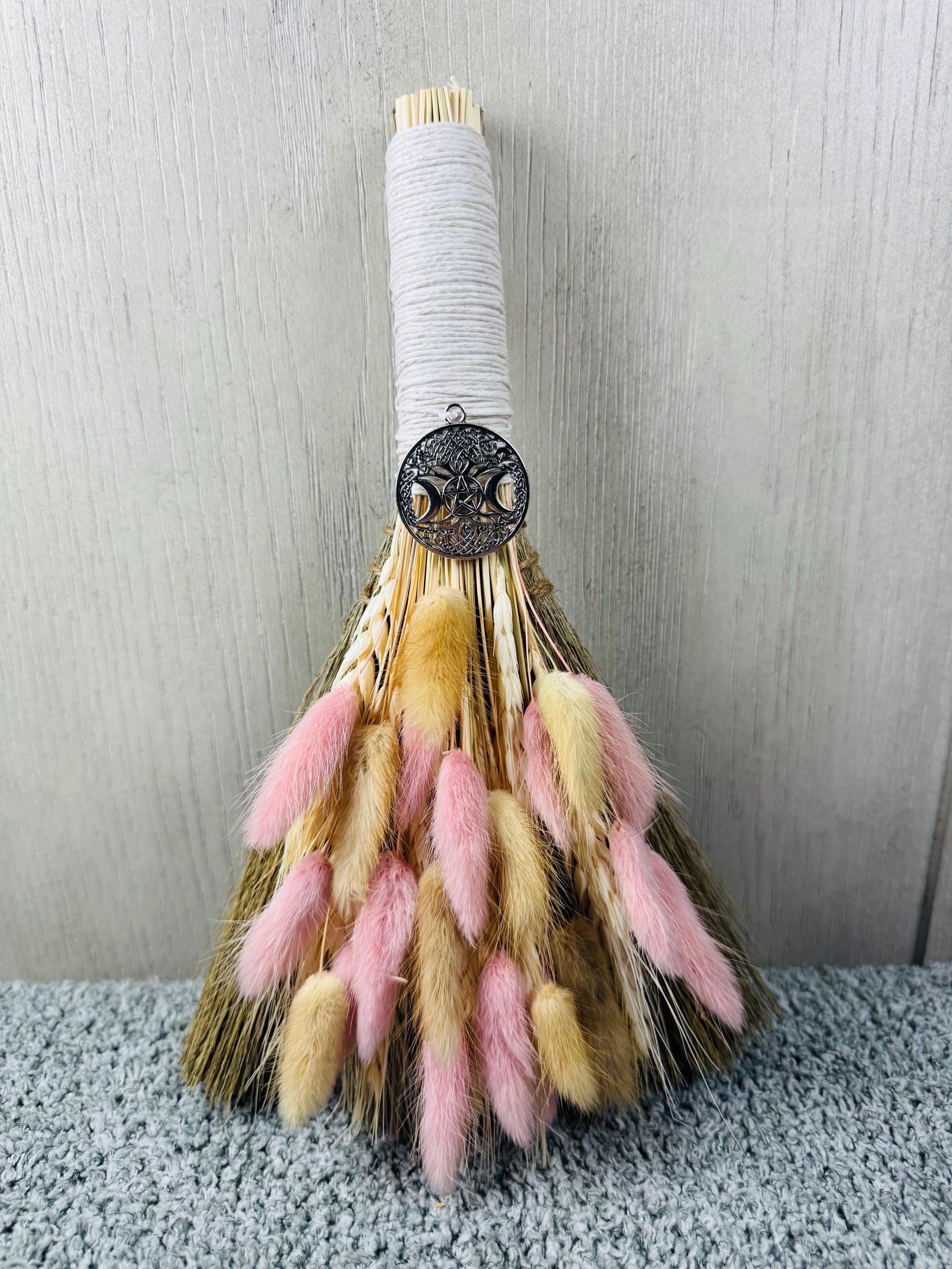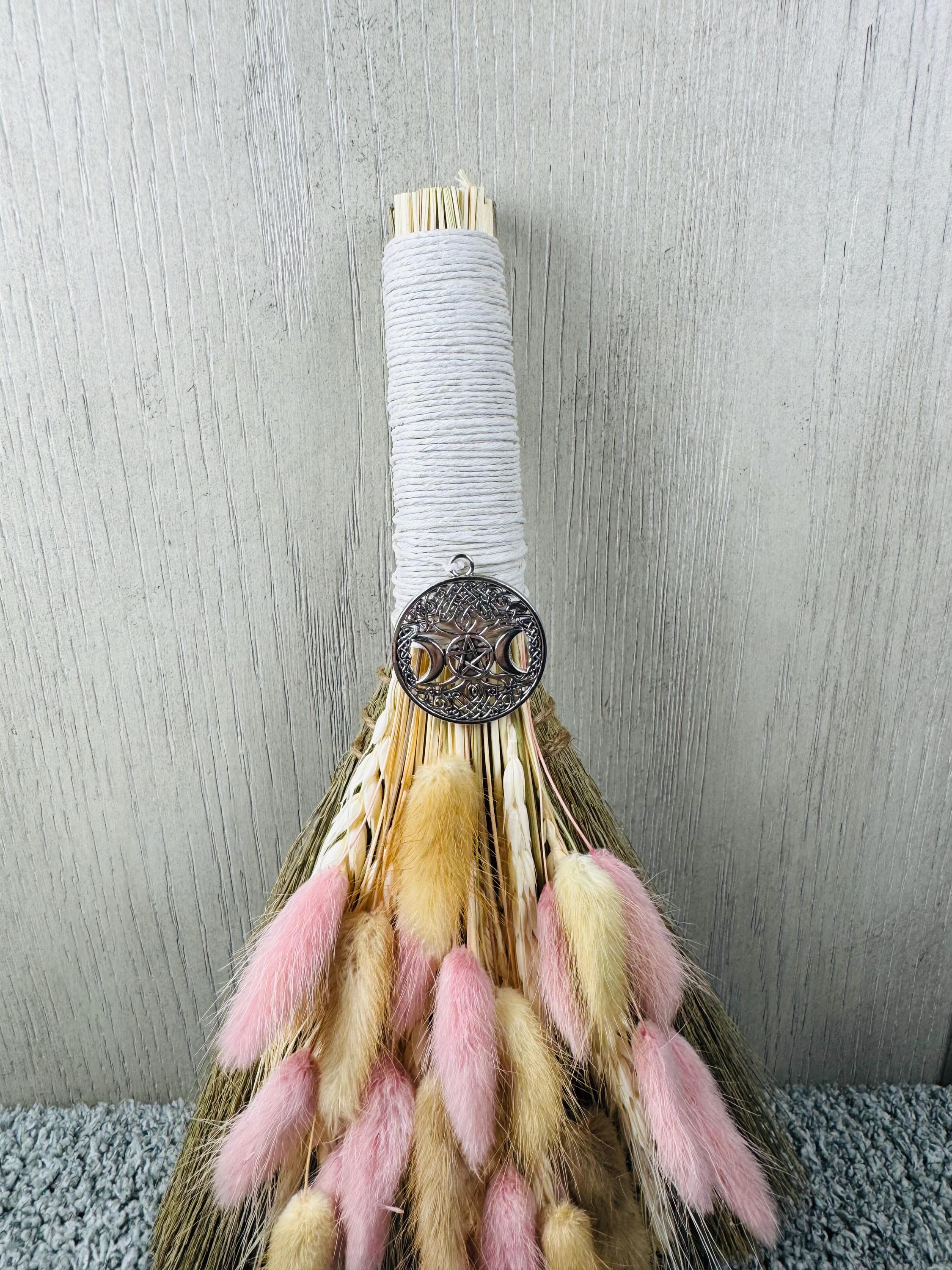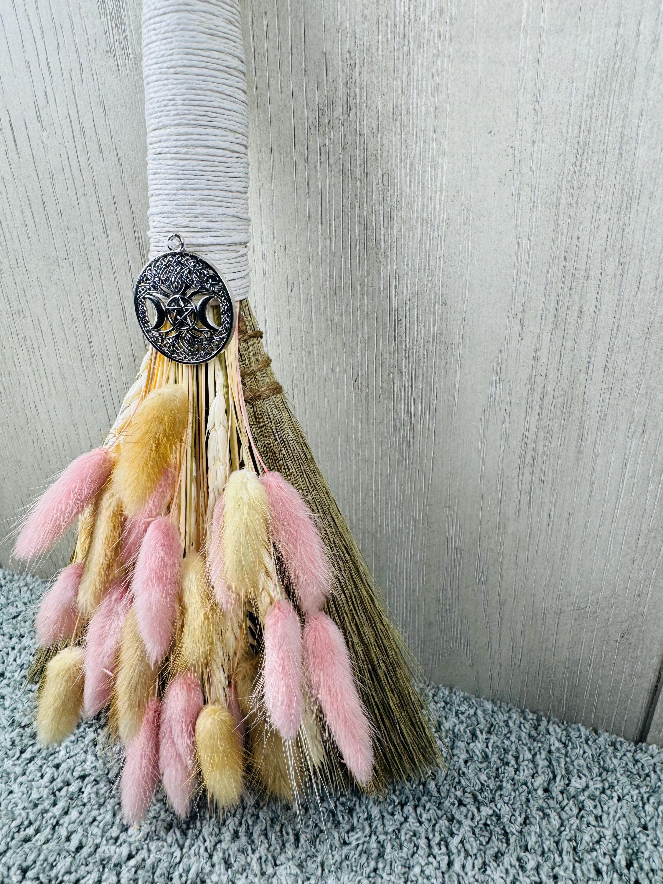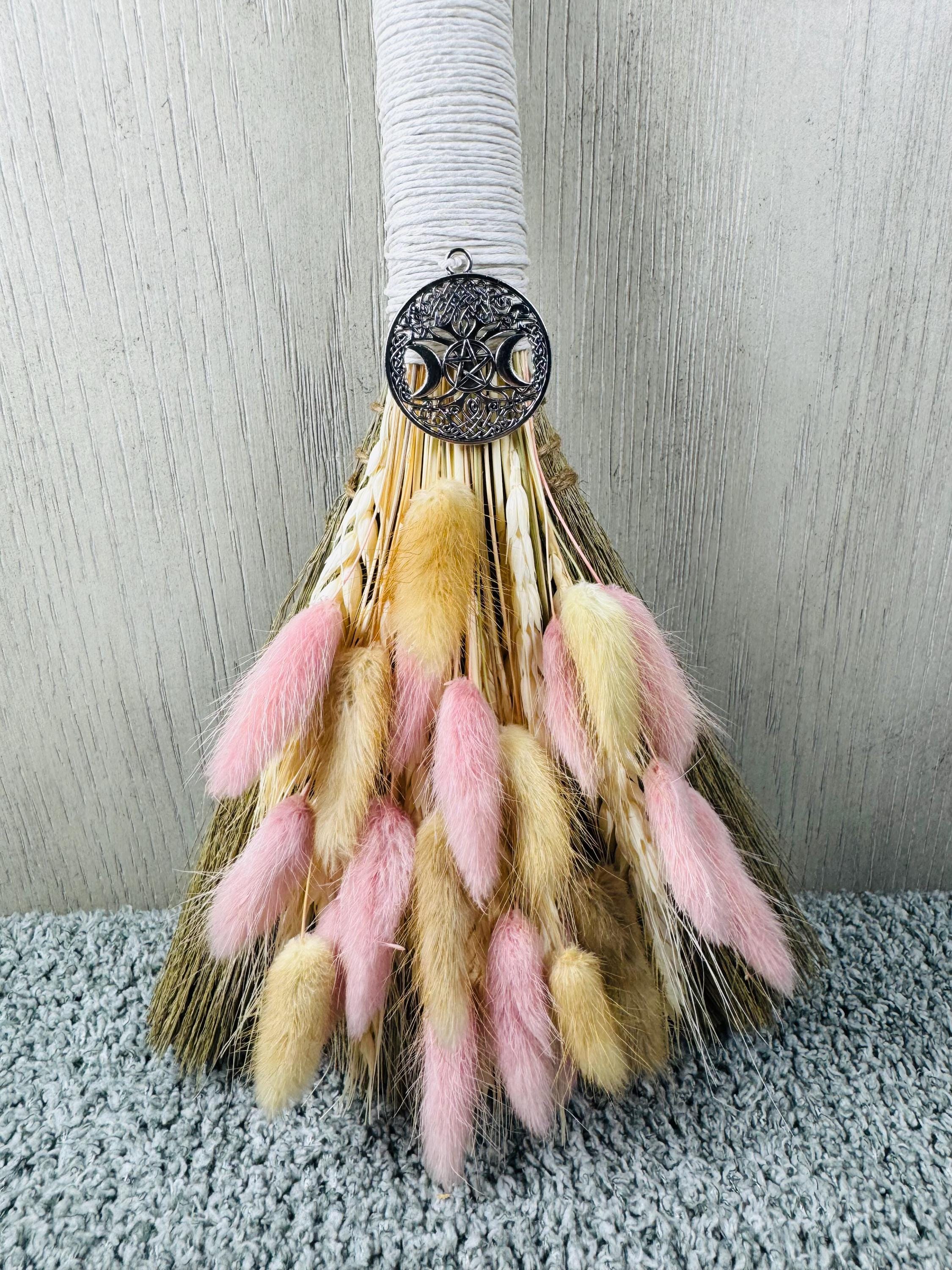 An altar besom is used in witchcraft for magical cleansing, purifying an altar space by sweeping away negative energy, and preparing the area for ritual. It is also used for other purposes like protection, marking sacred boundaries, and as a symbolic element in handfasting ceremonies. Made with real preserved dried flowers, the handle is wrapped with hemp, silver Tree of Life Charm, and measures 10" Long.