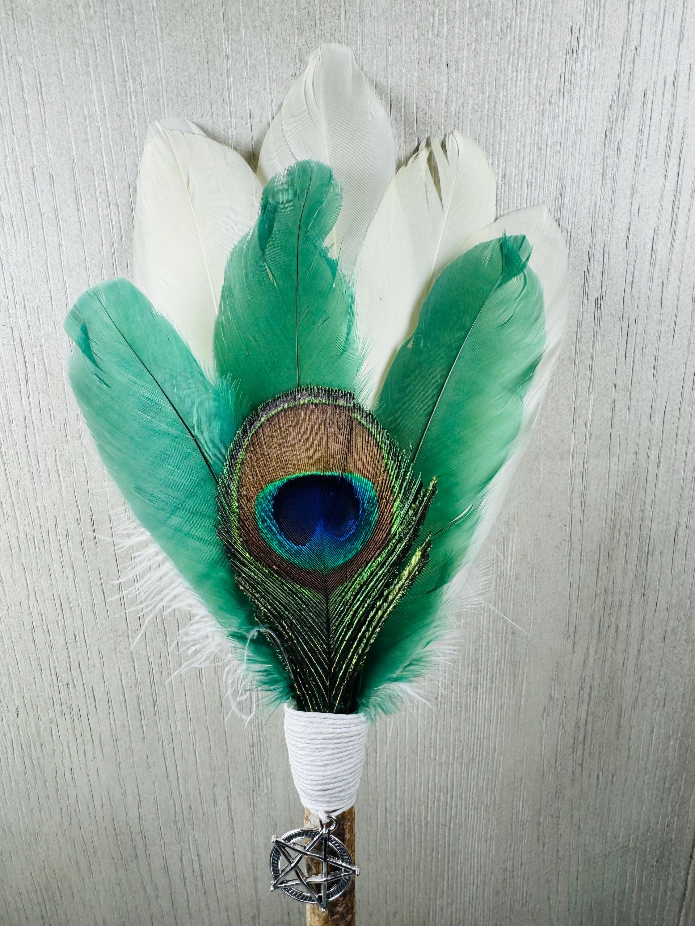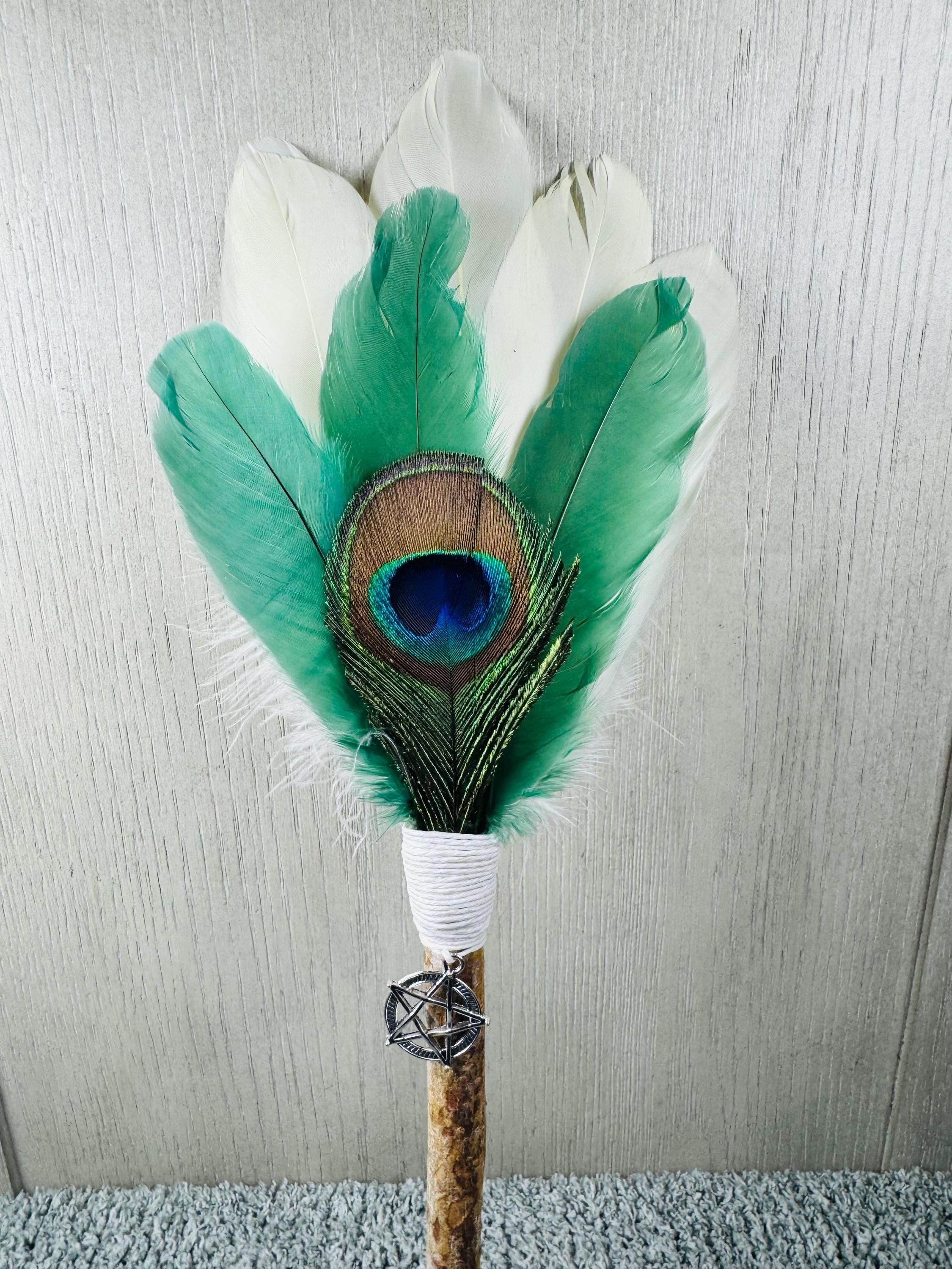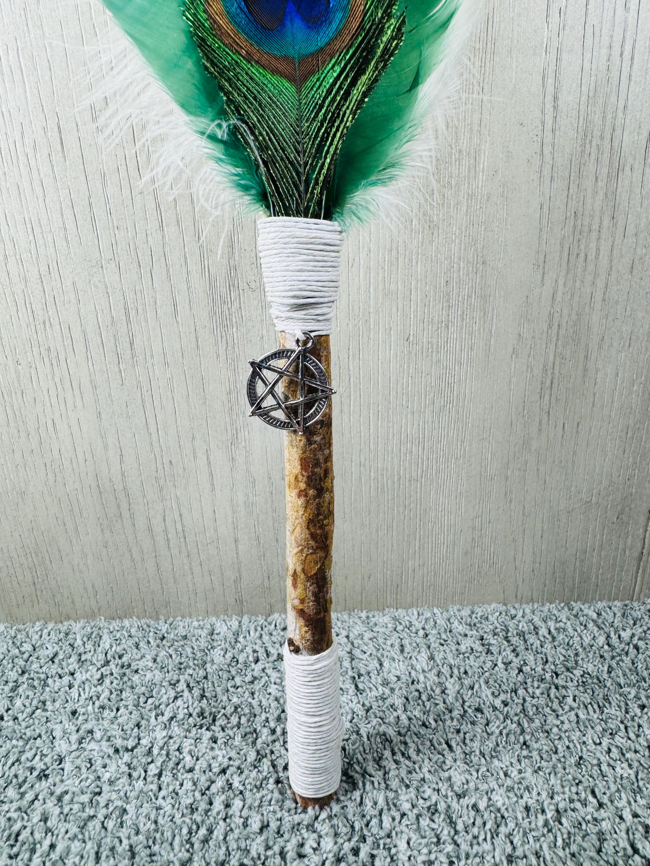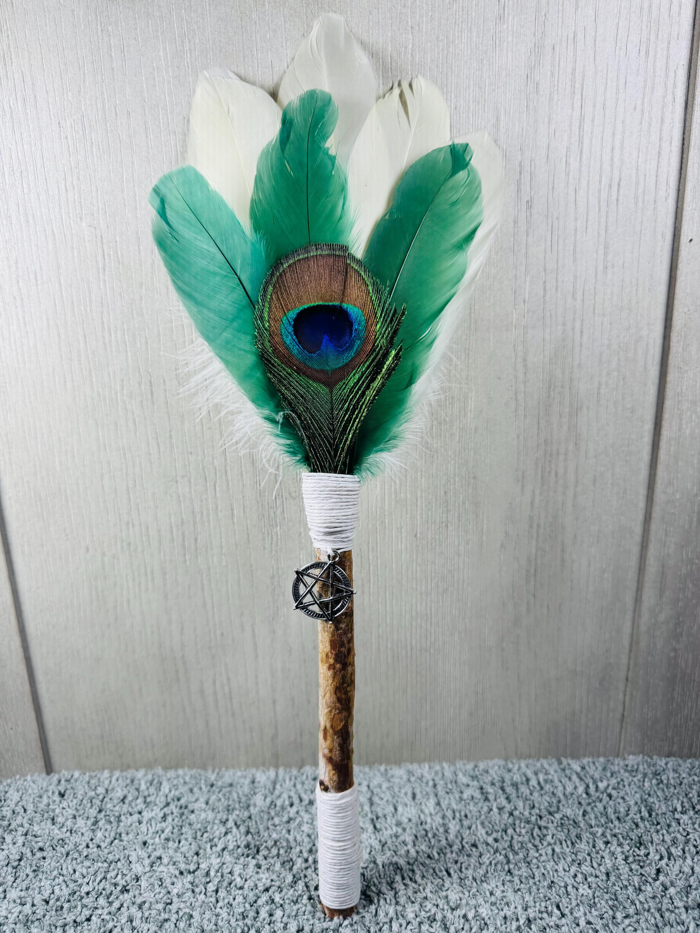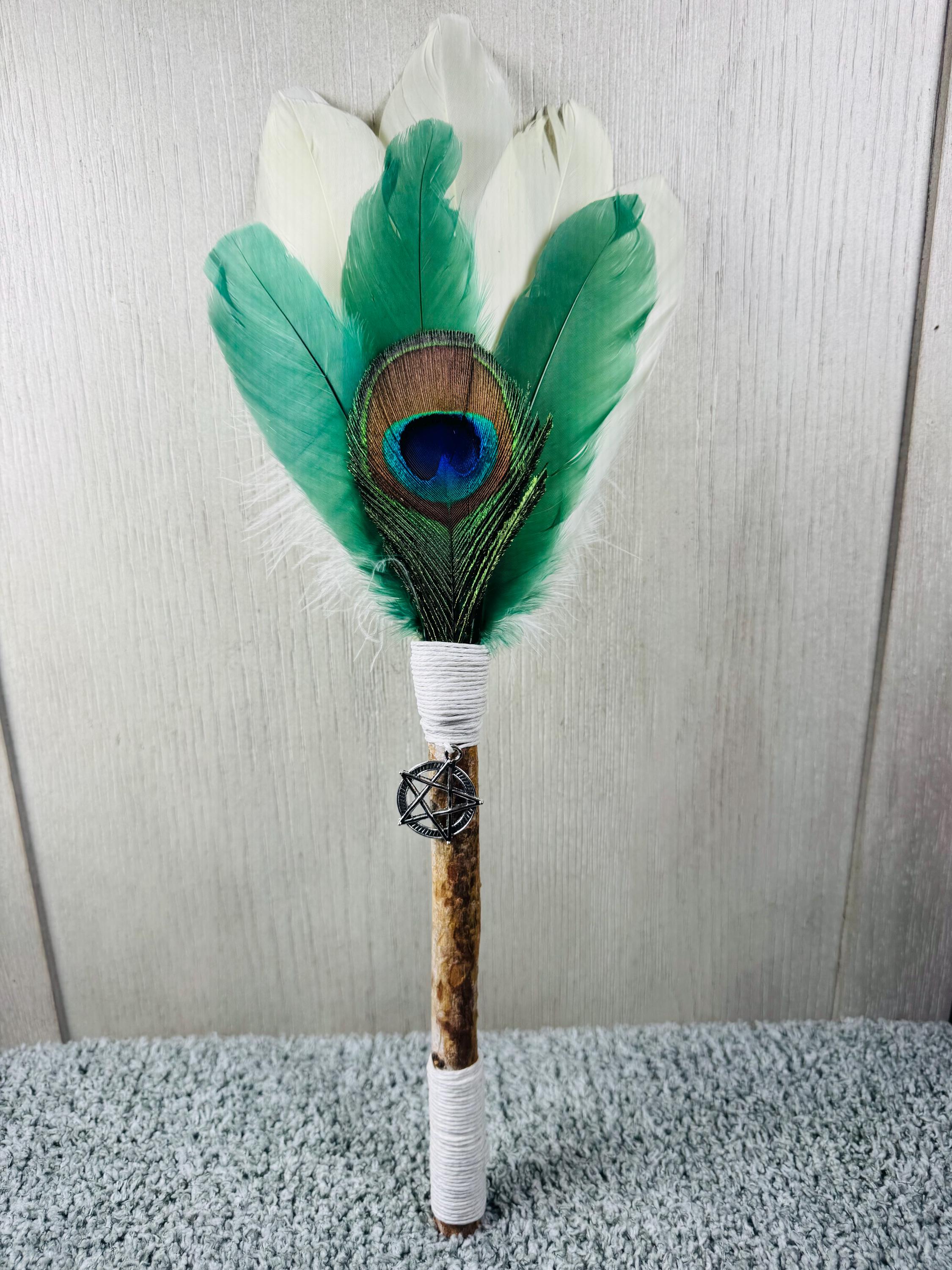 14" Smudging Feather Fan/Ceremonial. Made with 3 Different types of feathers, and White Birch Wood Handle, and a Silver Pentacle Charm. The feathers are not plucked they are harvested FALLEN feathers. The handle and top of fan where feathers are attached are wrapped with Hemp. The ritual feather fan is used to smudge spaces with Palo Santo, Sage and other incenses. When smudging, use the feather fan to softly direct the smoke to the desired direction. Keep it in a sacred place like an altar. Blessed Be!