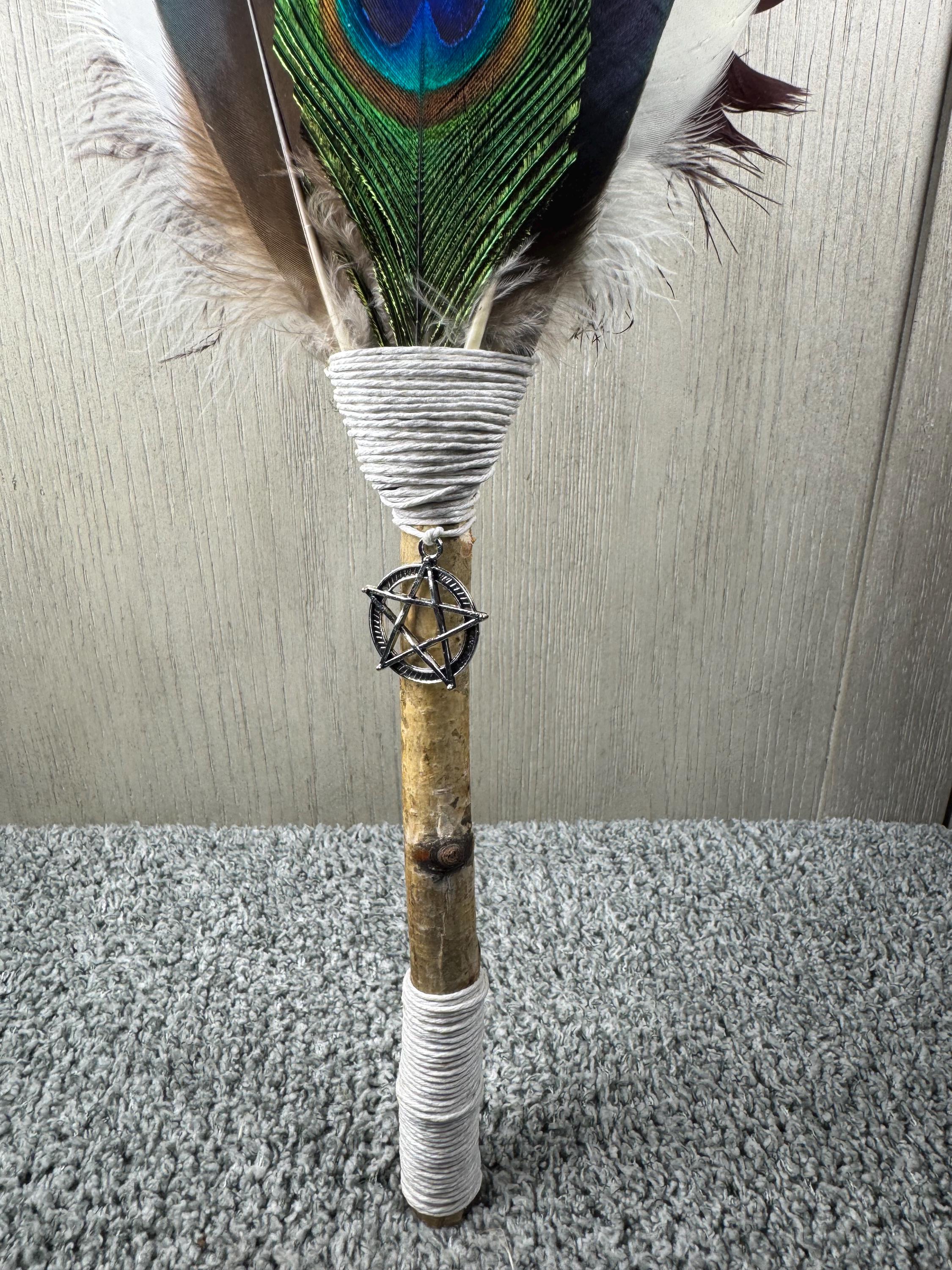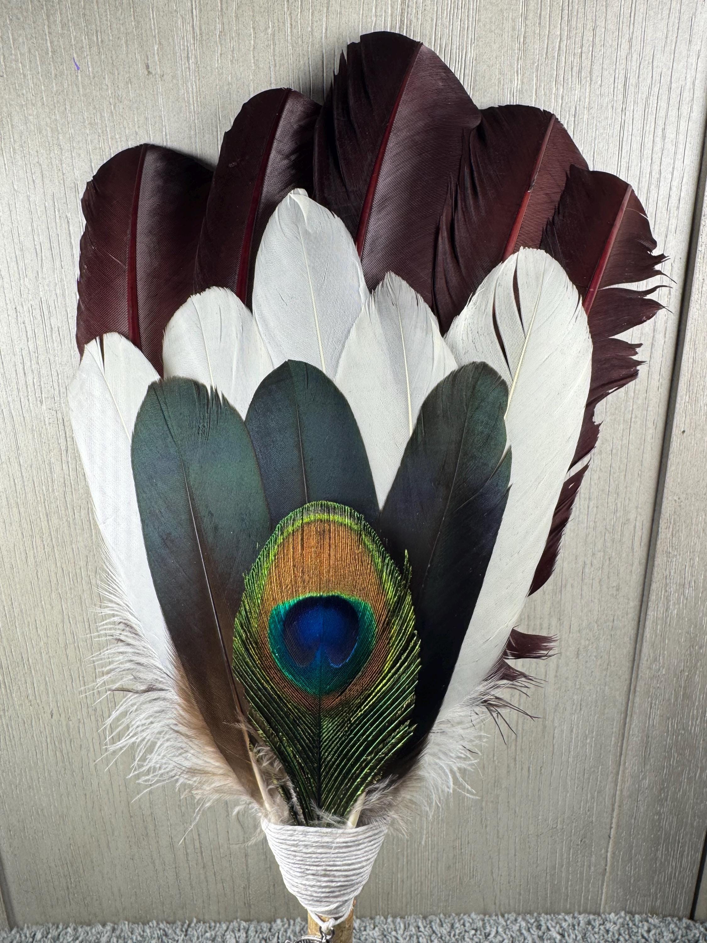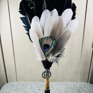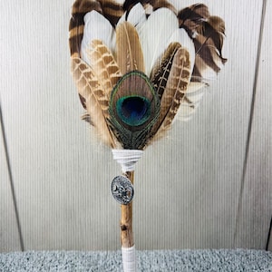 16" Smudging Feather Fan/Ceremonial. Made with 4 Different types of feathers, Silver Charm, and White Birch Wood Handle. The feathers are not plucked they are harvested FALLEN feathers. The handle and top of fan where feathers are attached are wrapped with Hemp. The ritual feather fan is used to smudge spaces with Palo Santo, Sage and other incenses. When smudging, use the feather fan to softly direct the smoke to the desired direction. Keep it in a sacred place like an altar. Blessed Be!