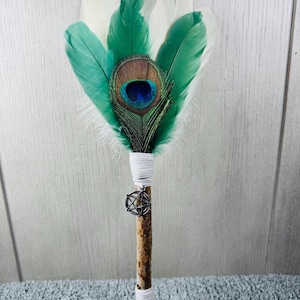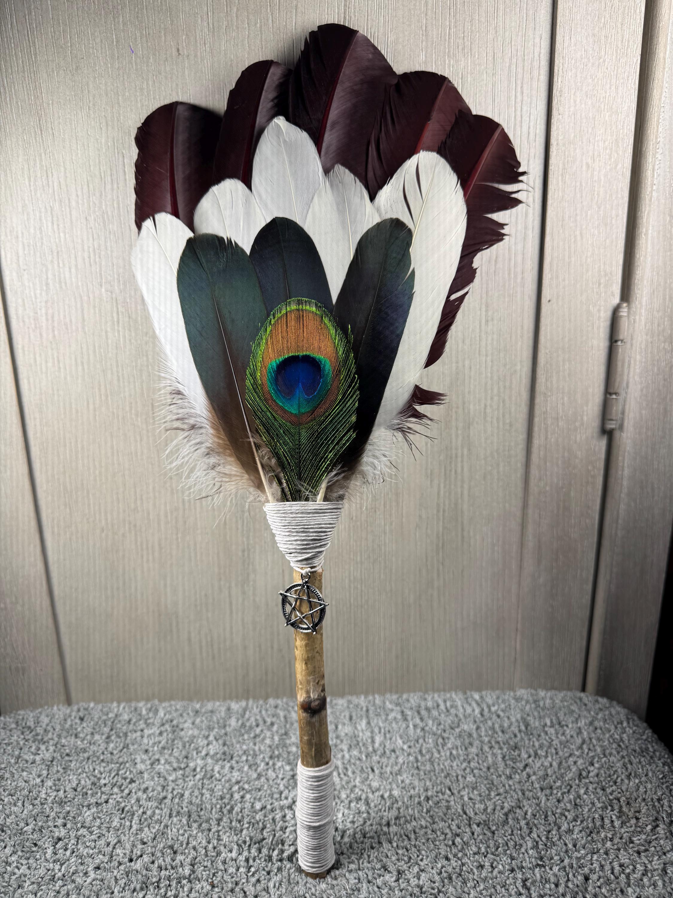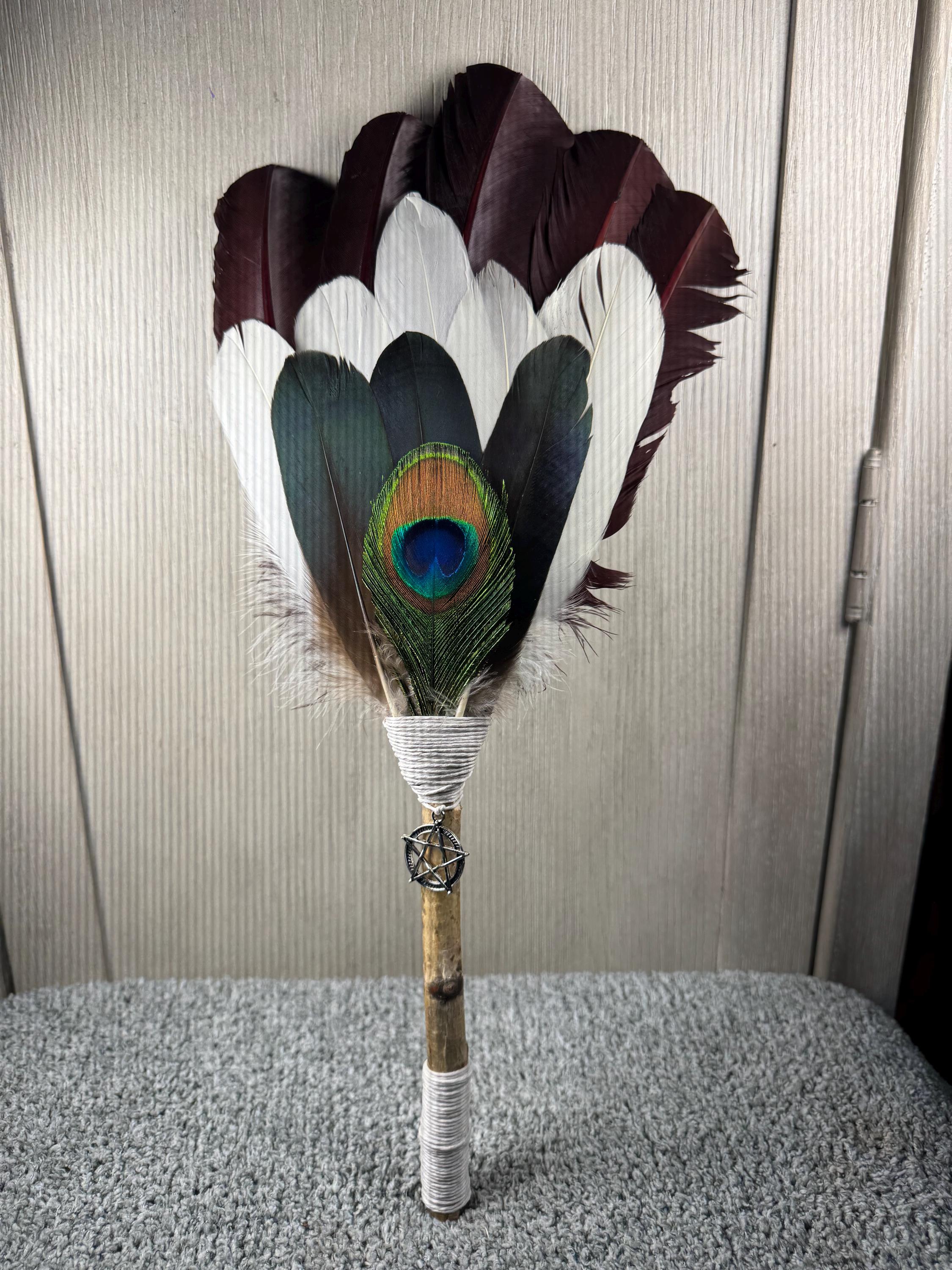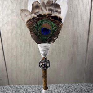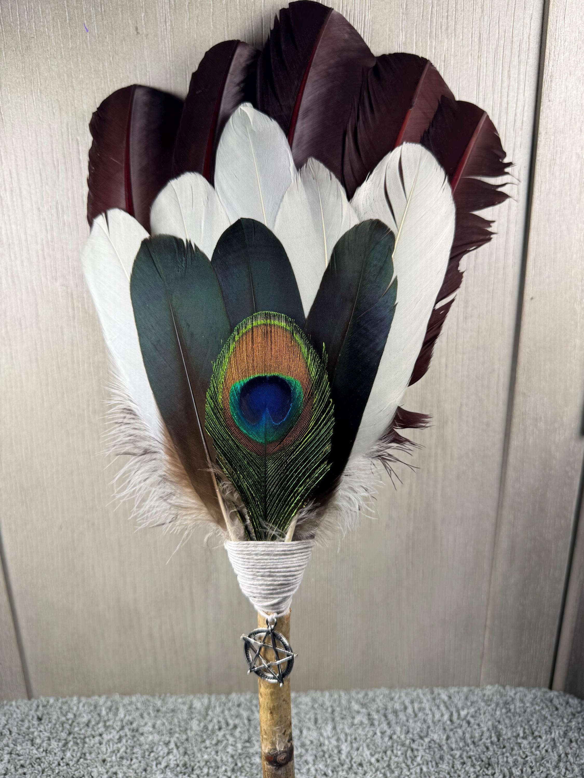 16" Smudging Feather Fan/Ceremonial. Made with 4 Different types of feathers, Silver Charm, and White Birch Wood Handle. The feathers are not plucked they are harvested FALLEN feathers. The handle and top of fan where feathers are attached are wrapped with Hemp. The ritual feather fan is used to smudge spaces with Palo Santo, Sage and other incenses. When smudging, use the feather fan to softly direct the smoke to the desired direction. Keep it in a sacred place like an altar. Blessed Be!